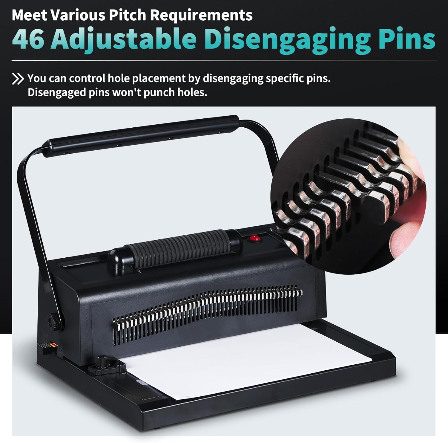 - 【Adapting to Various Pitch Requirements】The coil binding machine with 46 adjustable disengaging pins offers precise hole punching for any paper size and matches different coil pitches. This feature helps avoid unwanted holes and ensures professional results. It simplifies the binding process, providing flexibility and accurac.