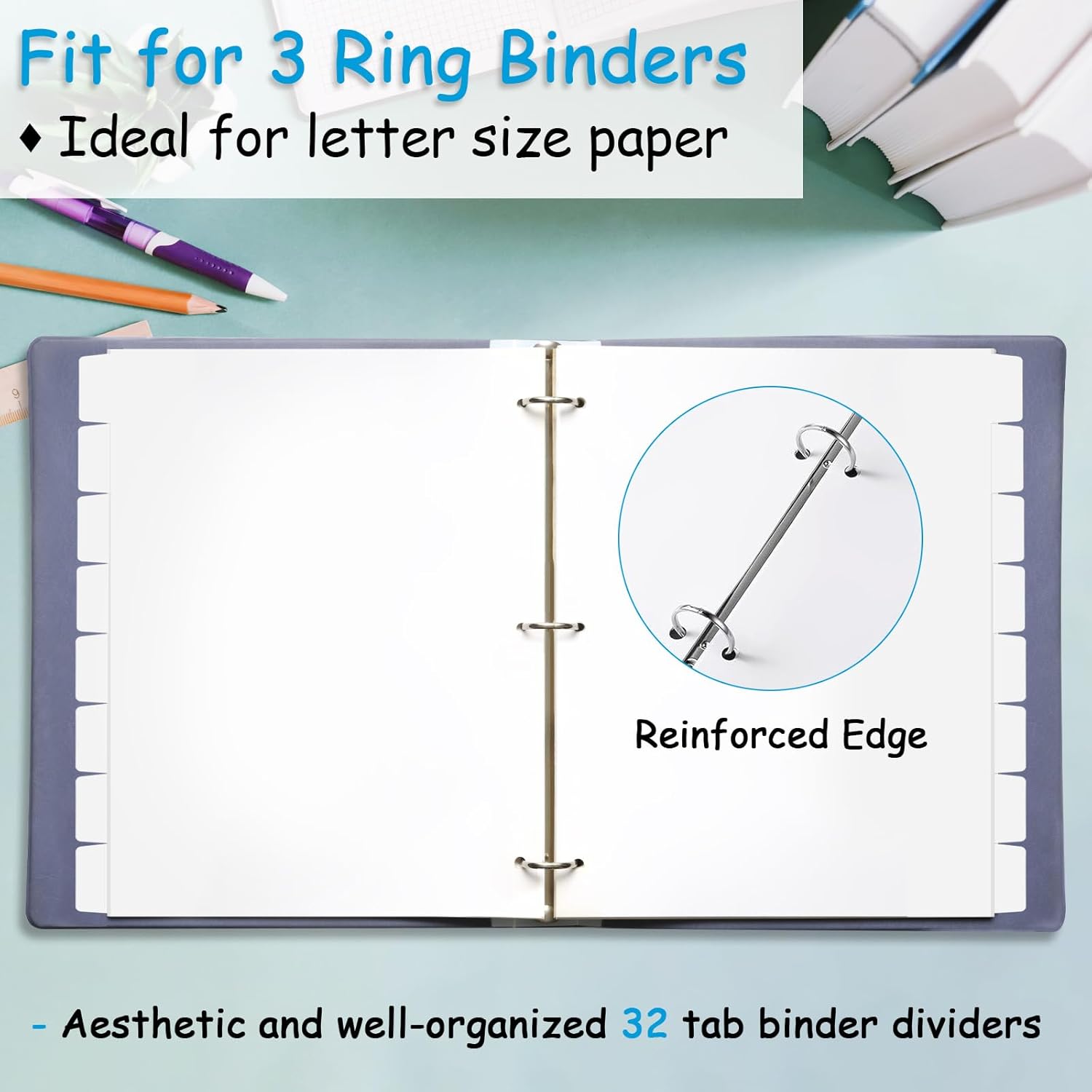 Binder Dividers for 3 Ring Binder, 1/8 Cut Tabs, Letter Size, Blank Write On Page Dividers with 8 Big Tabs for School Office Home, 4 Sets, 32 Dividers, White