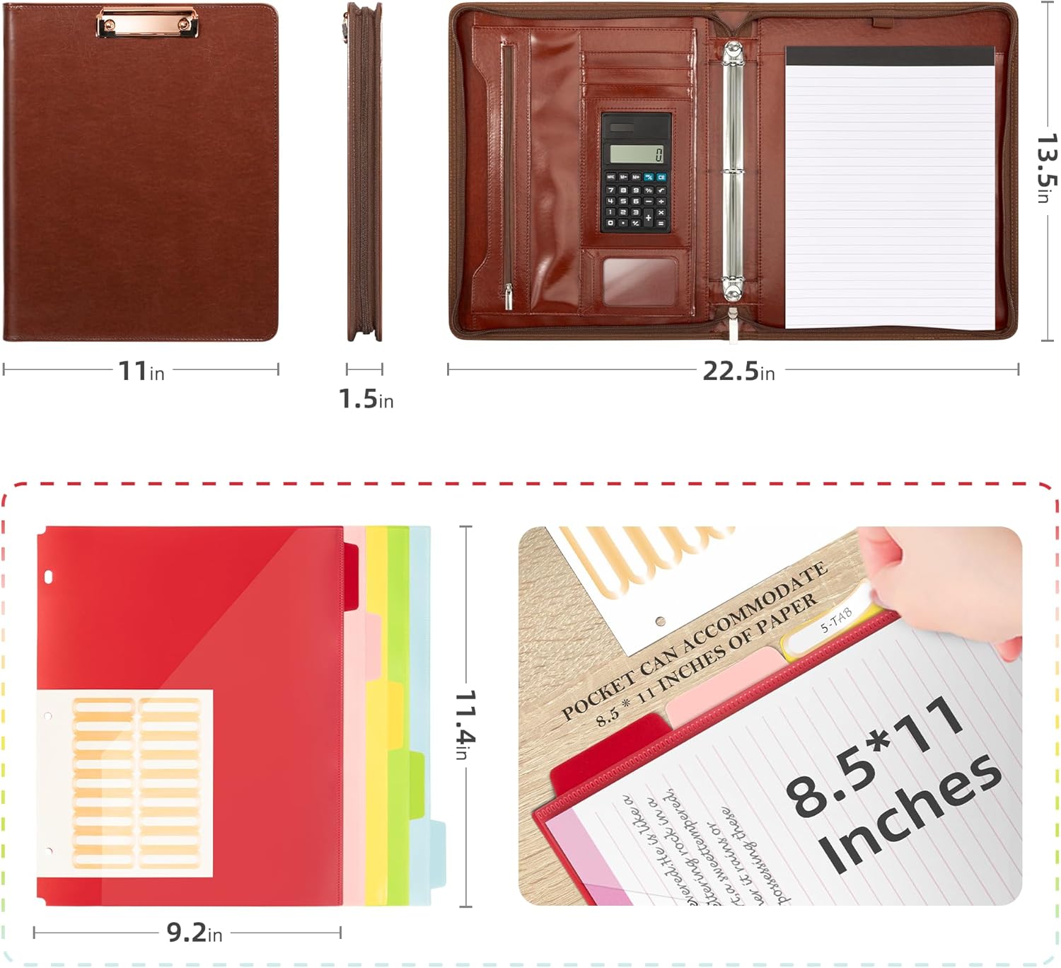 - 【Stay Organized】Built-in pocket, receipt/sticker sleeve, can store loose documents. 4 card slots can store business cards, credit cards, etc. The zipper pocket can hold important items such as a cellphone and USB drive. Document/tablet sleeve for tablets, etc. Binder comes with 5 extra three-hole plastic colorful folders, 10 pockets to fit all standard US letter size paper (11*8.5"), plus 18 folder label stickers for organization.