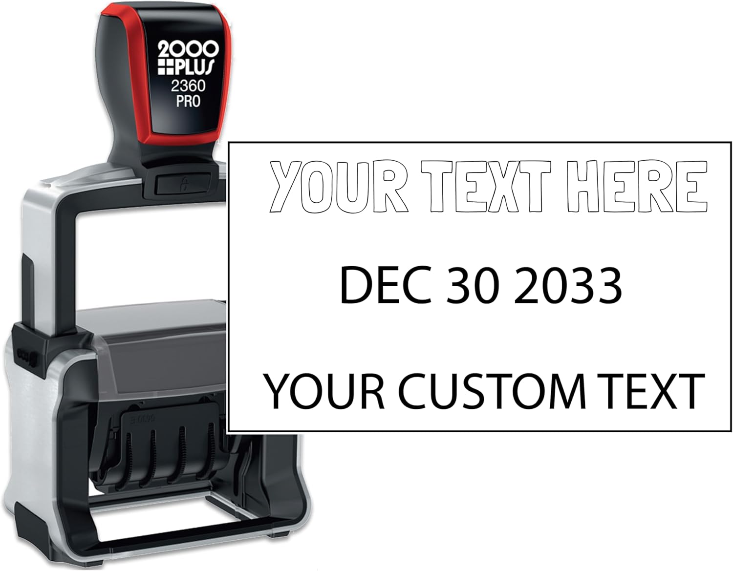 Heavy Duty Date Stamp with 2-Line Custom Text, 2000 Plus 2360 Self Inking Stamp - Choice of Ink Color (Black)