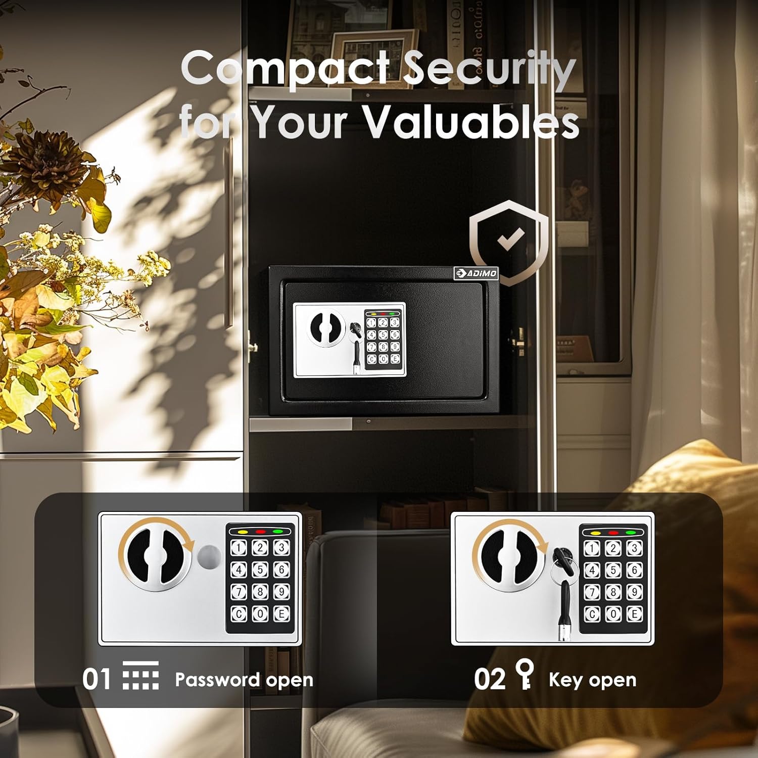 - Two Ways to Open: ADIMO home safes water and fireproof can open in two ways, making them more flexible and convenient. One way is personal code + turning knob; The other way is emergency keys+ turning knob. Features 2 emergency override keys to safeguard against forgotten passcodes or dead batteries.