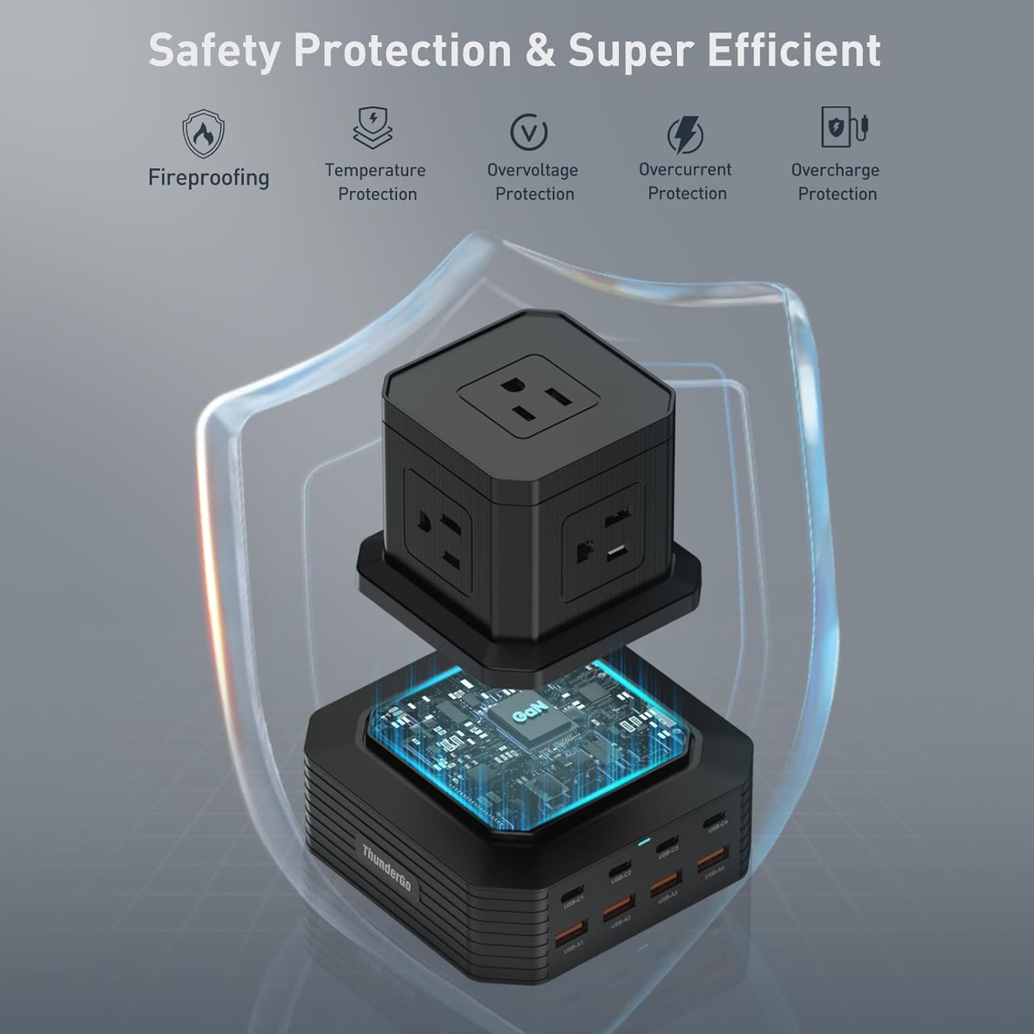 - 【100W Ultra-Fast Charging】This compact charging station with the vertical design, built-in with smart technology, detecting charging devices and deliver optimal charging speed automatically, compatible with most USB devices, Any C port used alone is a 100W output and also comes with a Socket function. Can fit in limited spaces and has a small footprint, perfect for desktop use to help reduce cord clutter, making it an all-in-one solution for your charging needs