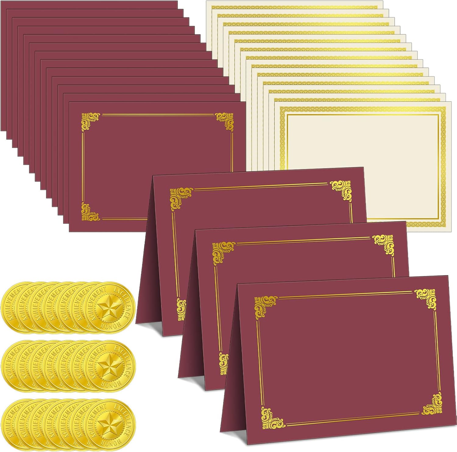 150 Pcs Certificate Kit Include 50 Certificate Holders 50 Paper and 50 Embossed Seal Stickers Diploma Covers for Graduation, Competition Supplies(Dark Red)