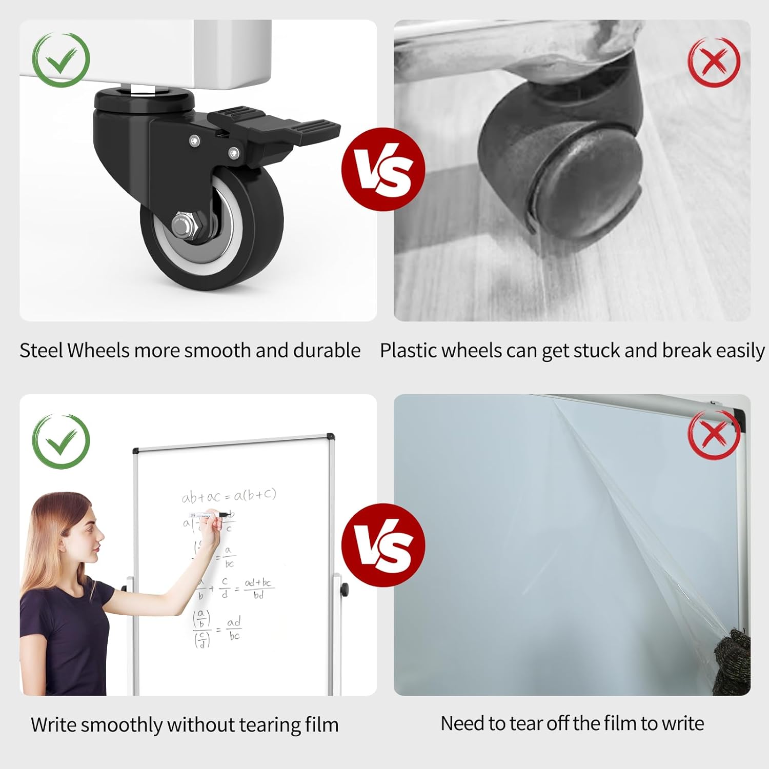 - Dual-sided Writing: Enjoy the convenience of two expansive 40x28 inch surfaces on our mobile whiteboard, seamlessly switchable with a simple stand rotation for enhanced productivity.