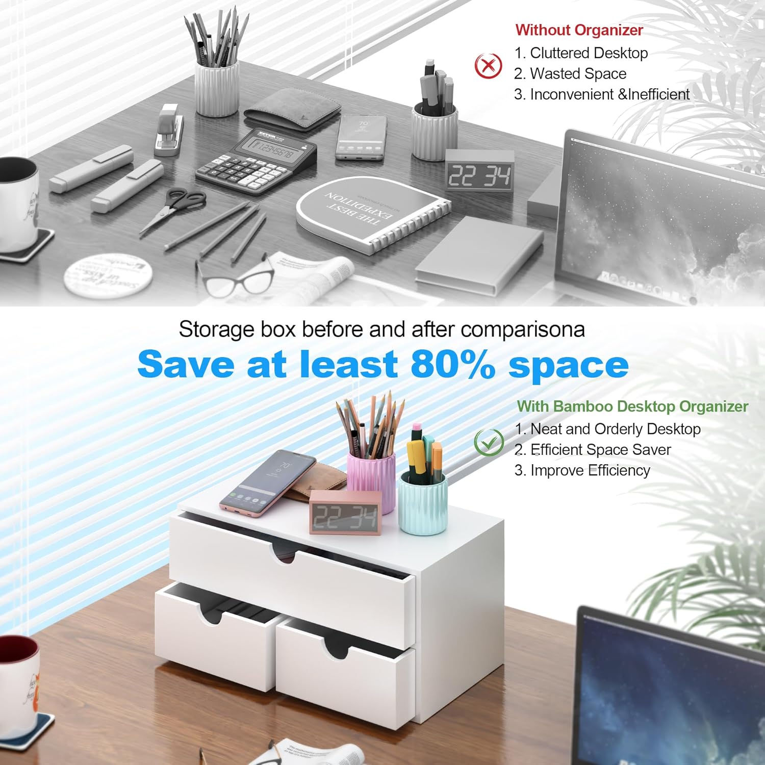 Bamboo Desk Organizer with Drawers Desktop Storage Drawers for Bills Office Supplies Kitchen Utensils Organizing Tool for Home Classroom Organization No Assembly (White)