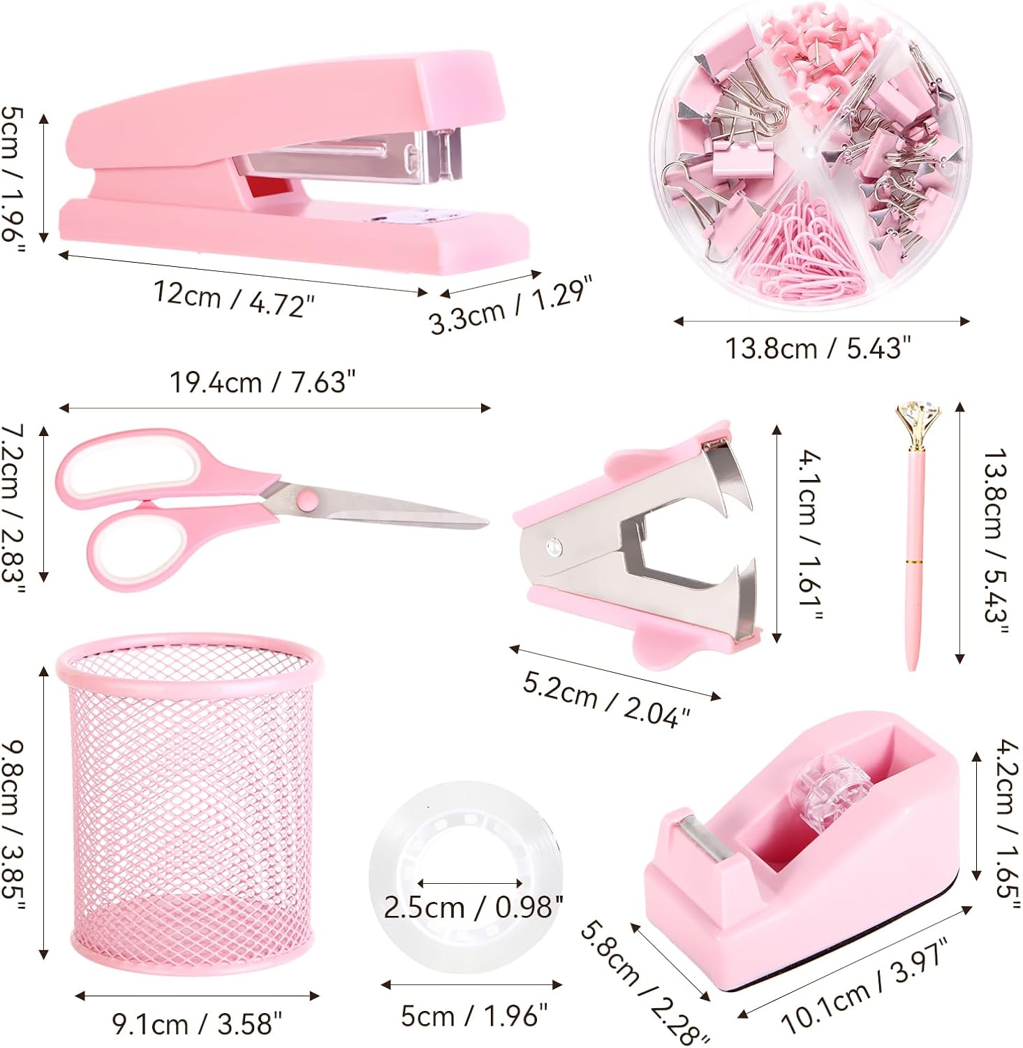 - List of Office Supplies Set:1*stapler, 1*staple remover, 1000*staples, 1*tape holder, 1*pen holder, 1*pens, 1*scissors, 1*Clear Tape and 1 box of binder clips; The size of desk accessories:stapler: 4.7 *2 *1.3 inch, tape dispenser: 4*2.3 *1.65 inch, staple remover: 1.6*2 inch, scissor: 2.8*7.6 inch, pen: 5.4 inch, pen holder: 4 *3.5inch.Such a complete pink desk accessories combination is enough to meet your school and office using needs.