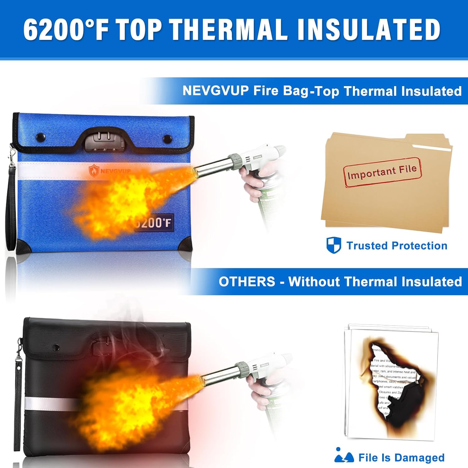 - Unique Heat Decay Structure: Thanks to the Upgraded 9 layers of functional materials with heat insulation, fireproof waterproof document bag can withstand high temperatures up to 6200°F; And the unique nested design allows fire safe bag has independent space between the layers of materials, so that heat transfer from the different non-direct contact media, constantly weakening, blocking heat transfer; Fire proof lock box give you enough time to save your valuables from fire