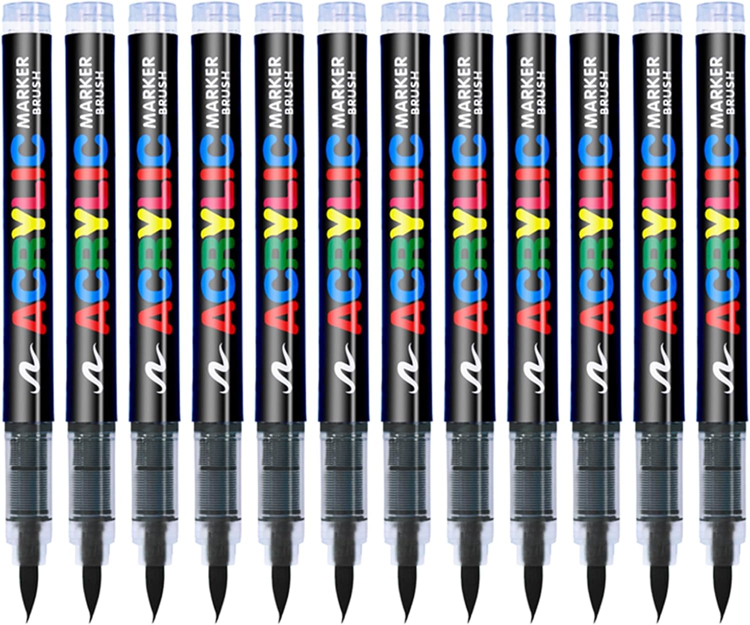 Acrylic Paint Pens, Soft Brush Tip Acrylic Paint Markers, Acrylic Markers Ideal for Canvas, Rock Painting, Wood, Stone, Glass, Ceramic, Fabric Painting, DIY Crafts (12 Pcs Black)