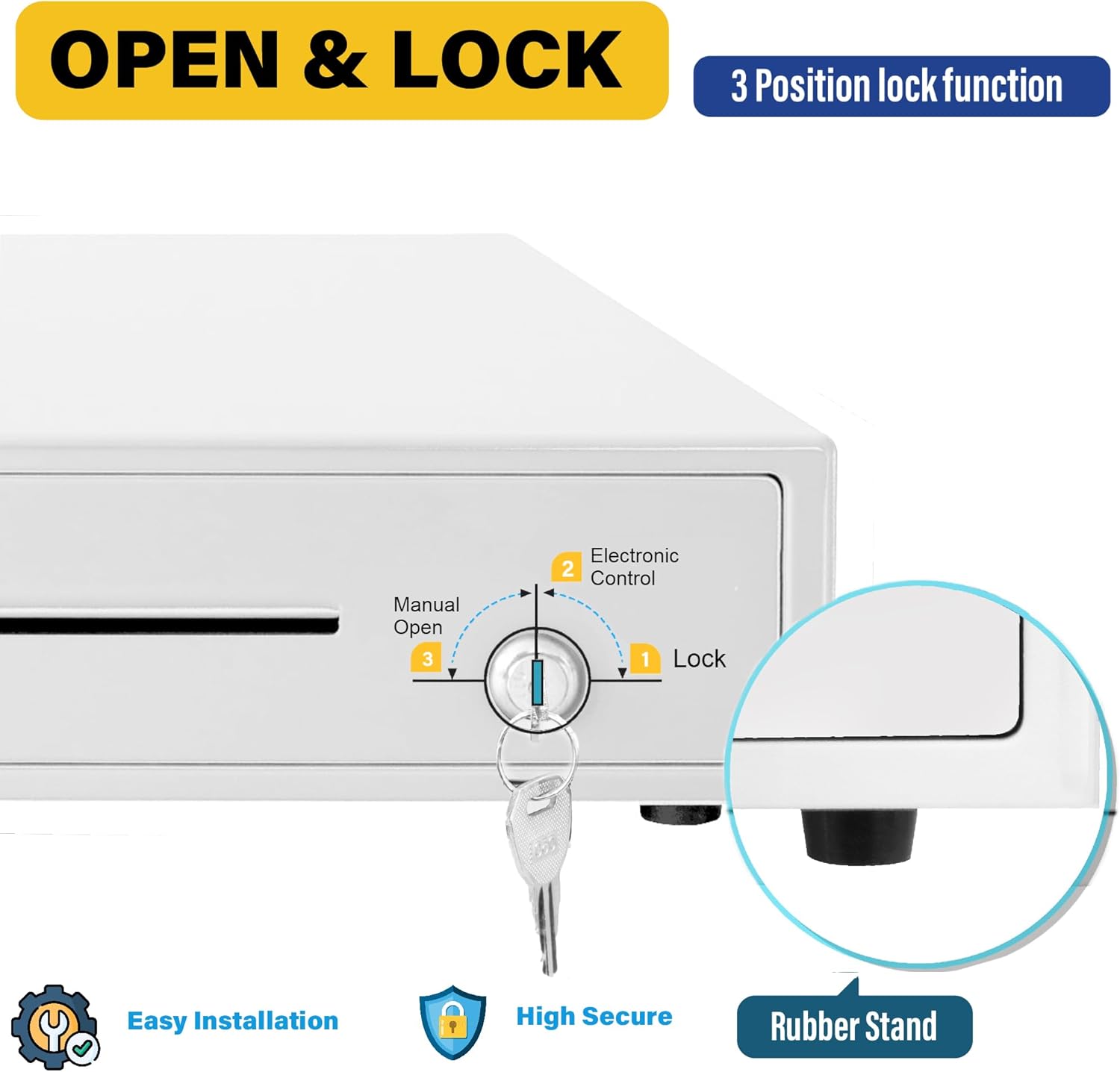 - đź’ł3-Position Lock& Dual Front Media Slots: This cash drawer not only ensures the highest level of security with a 3-position lock mechanism: 1-Lock, 2-Auto Open by Printer/POS, 3-Manual open