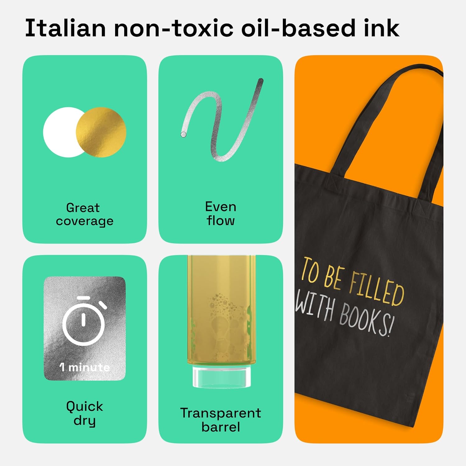- Non-Toxic: This oil paint set conforms to ASTM D-4236 safety standards. Plus, there’s no odor with your oil markers paint pens. Each gold and silver marker is ready to use with any project and is safe for kids and adults!