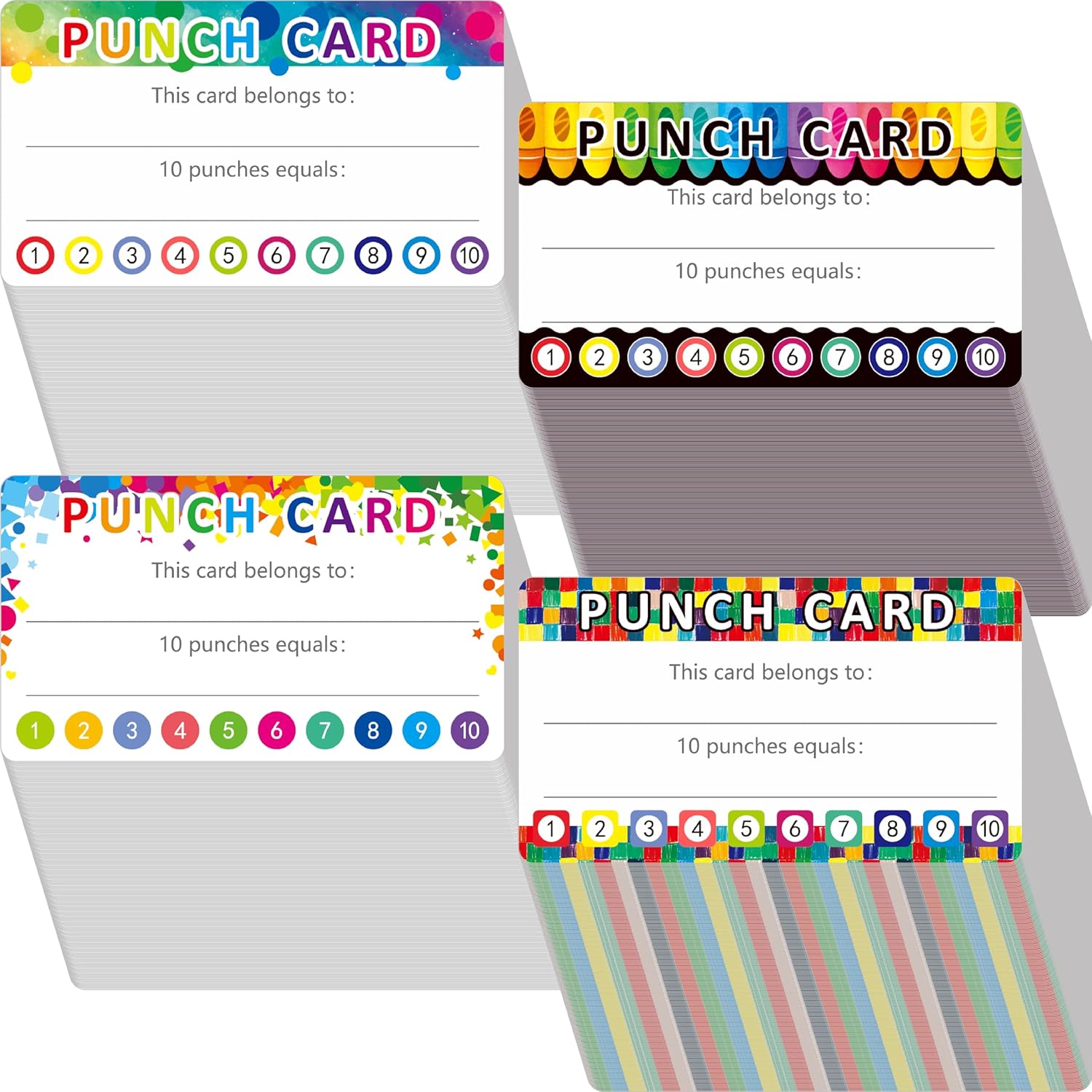 - Smart Design: Adorable punch cards feature bright and colorful elements in 4 unique designs. Designed with name and reward fields for easy use and you would hardly mis-punch with the discrete punch dots guide.