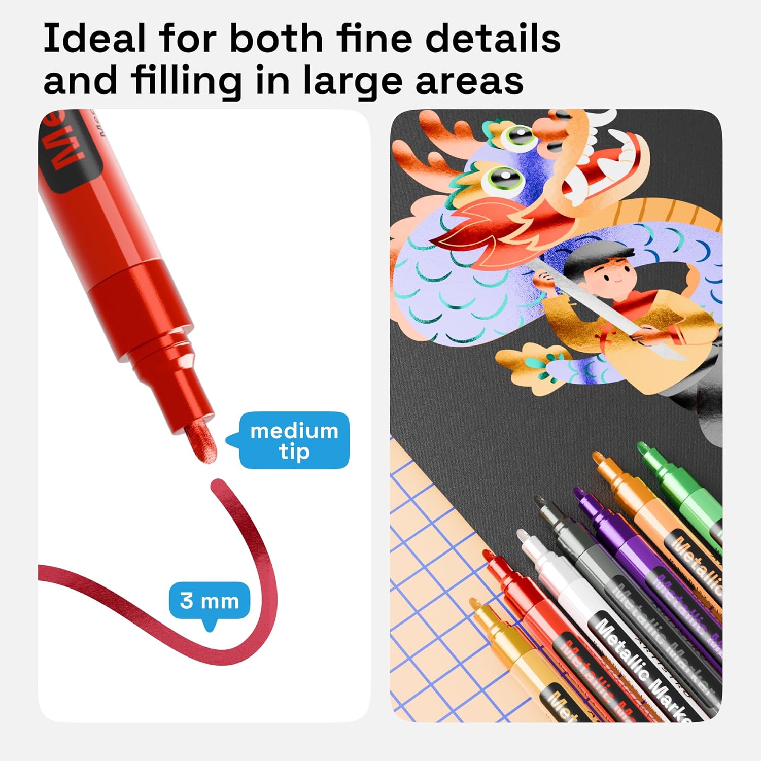 - Dual Effect: Paint on black or white paper with these metallic paint markers to create amazing effects. These metallic marker pens are perfect for DIY projects for Christmas, birthday gifts, or wedding decorations.