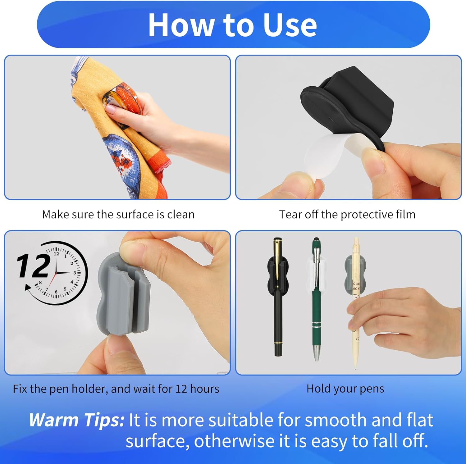 - ăStrong Adhesive Backing & Do Not Fall OffăBiottro pen holder comes with strong adhesive on the back that makes installation a breeze while leaves no residue. Just peel the paper backing off and adhere them to any flat surface where you would like, and they stay very well, even if accidentally bump it! Just make sure that you thoroughly clean the surface before applying the adhesive strips and then let them sit for a while before using the holder