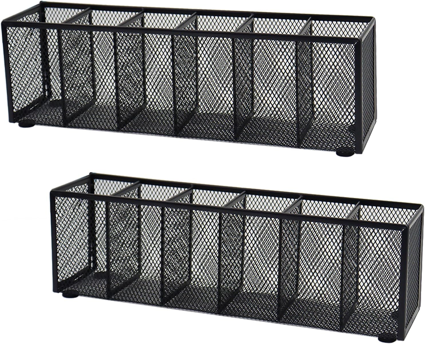 2PCS Black Mesh Pen Pencil Holder, Small Metal Desk Organizer Desktop Stationery Office Supplies Acessories Storage Stand, 6 Compartments Brushes Holder for Home School Classroom Teachers