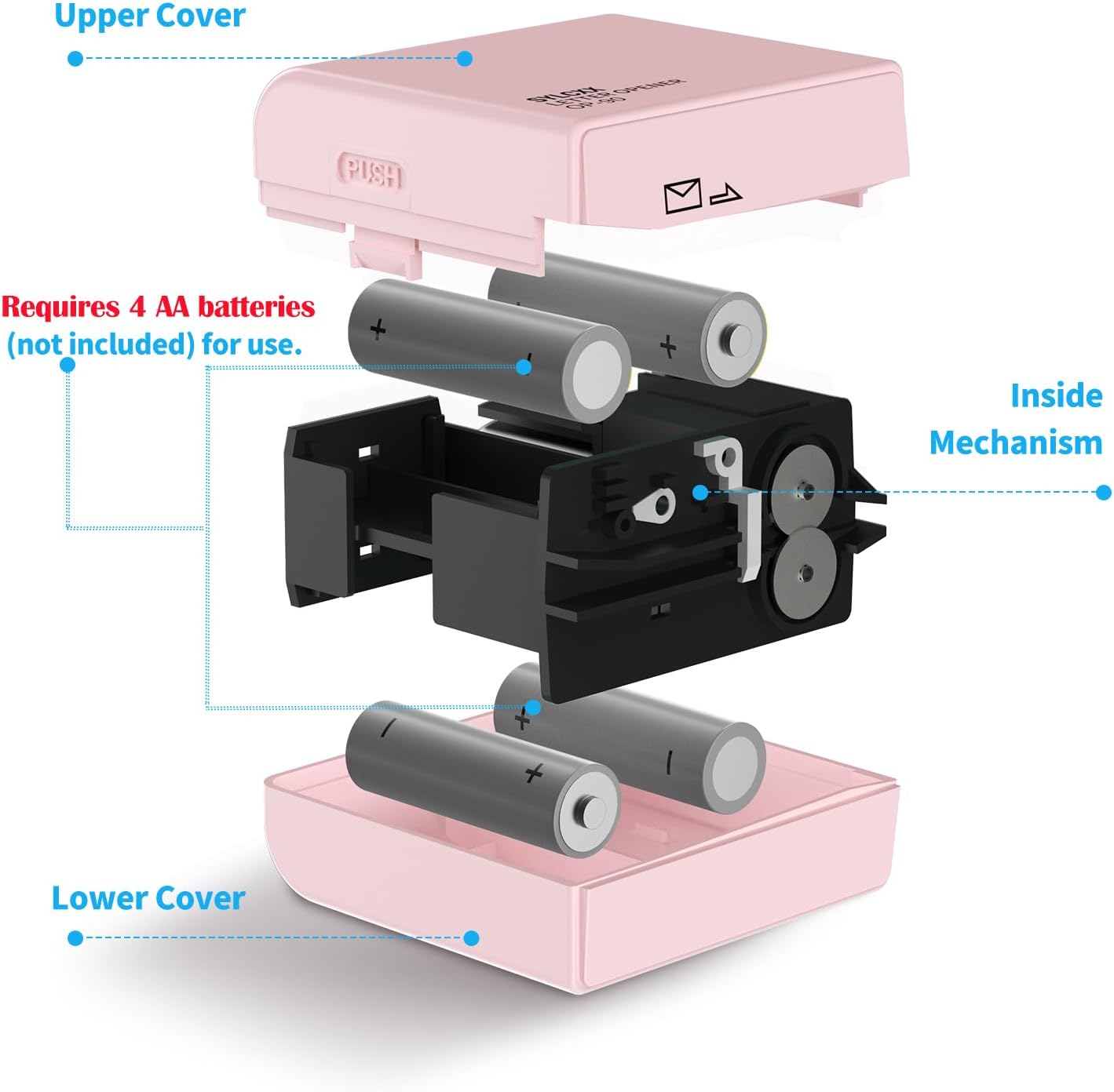 - Letter opener requires 4 AA batteries (not included). Install the 4 AA batteries in the correct way: 1, Hold the lower cover with your left hand, press the "PUSH" buttons on both sides of the upper cover firmly with your right hand. 2, Take out the internal structure, put 2 AA batteries on the front side of the internal structure (make sure of the +/- direction), and put 2 AA batteries on the reverse side of the internal structure. 3, Put on the upper and lower covers and start working