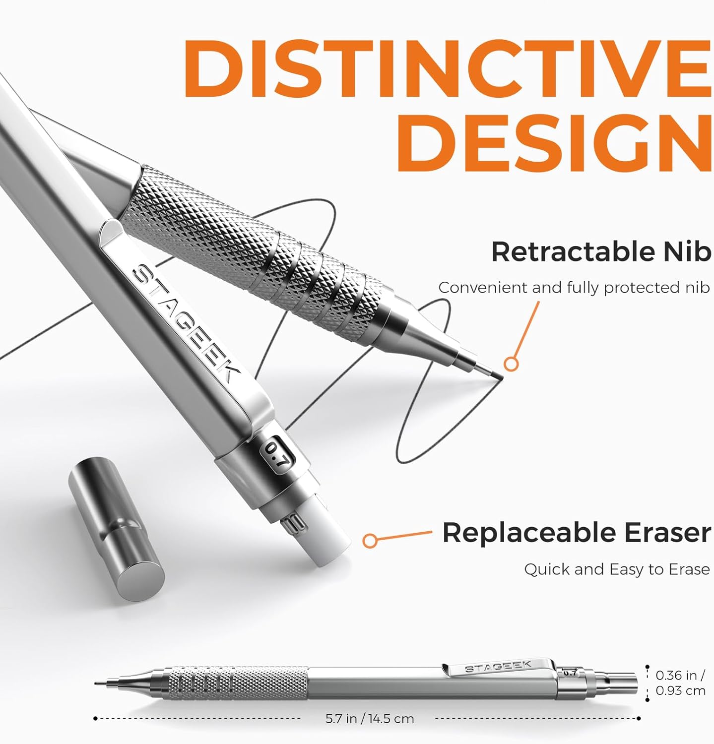 - Exquisite Artist Set: Includes 5 PCS metal drawing mechanical pencils (0.3, 0.5, 0.7, 0.9, 2.0mm), 4 tubes of 0.3, 0.5, 0.7, and 0.9mm graphite lead refills, 4 tubes 2.0mm (4B, 2B, HB, 2H,) graphite lead refills, 2 tubes 12 color lead refills, 2pcs 4B soft erasers, a kneaded eraser, a gum eraser, 2pcs lead sharpener, 9pcs cap eraser refills, a plastic case.