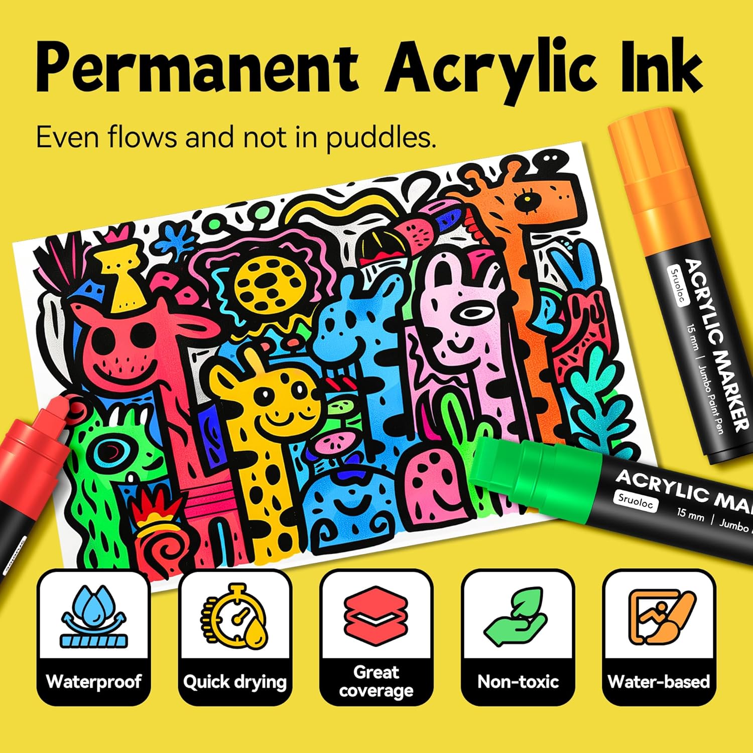 - Jumbo Markers Set: SRUOLOC jumbo markers are made with the highest quality water-based acrylic ink. That is waterproof, quick-drying, permanent , and smooth flow