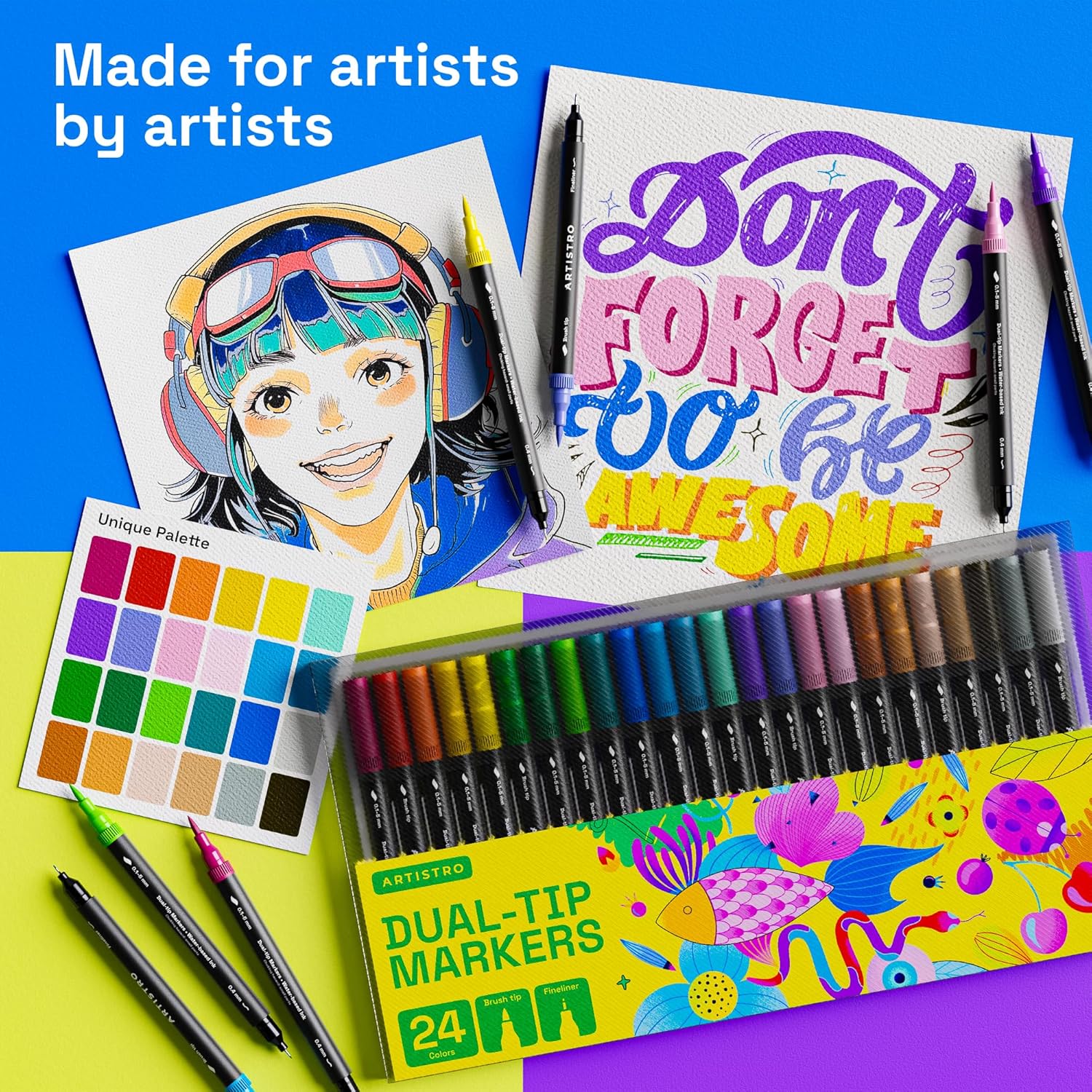 ARTISTRO 24 Brush Marker Pens Coloring Markers for Adults Brush Tip & 0.4mm Fineliner Pens Coloring Markers No Bleeding
