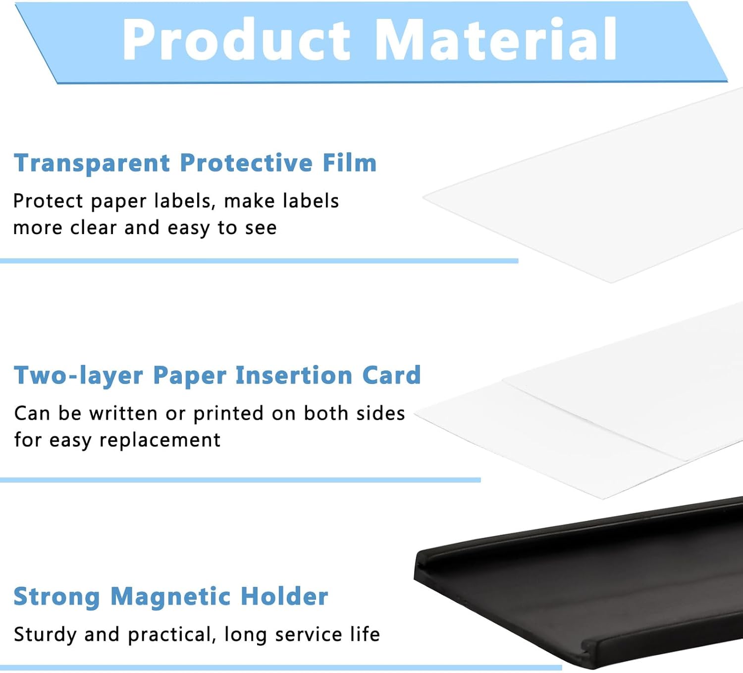 - SUFFICIENT QUANTITY: Set includes 30 pcs magnetic label holders, each includes 1 clear protective film and 2 pcs white replacement paper, providing you with plenty of spare parts