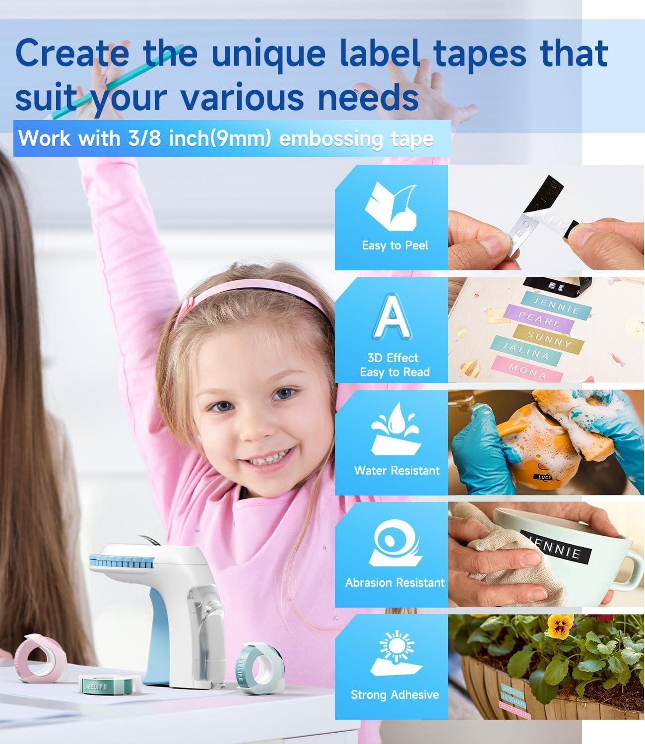 - ăPackage includesăIt will come with one blue embossing label maker machine and 10 embossing label tapes(5*Black/1*Macaroon Purple/1*Macaroon Pink/1*Macaroon Blue/1*Macaroon Green/1*Gold Embossing tapeïŒfor continuous use.