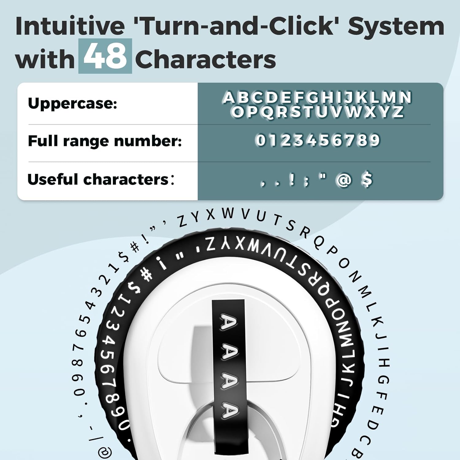 - Upgrade Version Vintage Embossing Label Maker Machine - Vixic embossed label maker manual is more user-friendly. 1.transparent handle for viewing consumption of embossing label tapes. 2.Featured wheel with 48 characters, including full English, numeric characters, and common symbols. 3.Ergonomic Design fits the curvature of your hand to make printing easier. 4. Embosser Label Maker Printing 3D effects embossing label tape for easier to read. 5.Built in cutting design is safer for kids and older