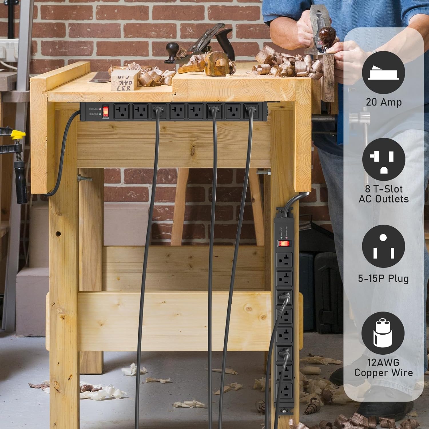 JUNNUJ 20 Amp Power Strip Surge Protector 4800J, Heavy Duty 8 Outlet Metal Multi Angle Mount, 20A Garage Power Strip Shop 6-20R T-Slot, 5-15P Plug 12 Gauge Extension Cord 10ft for Appliance