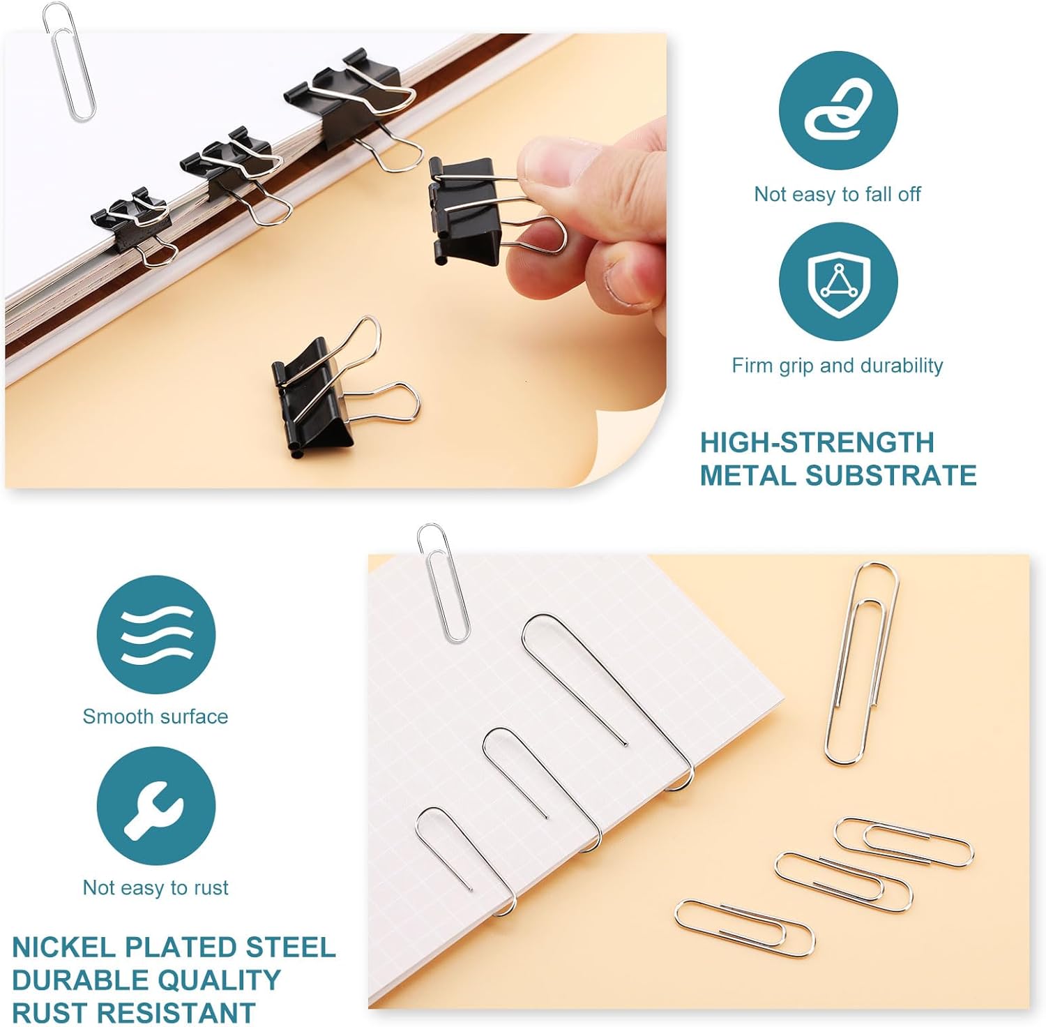 - DURABLE AND RELIABLE: The binder clips are crafted using high-quality metal iron and feature handles treated with advanced nickel plating technology. These premium materials provide the clips with a smooth surface, enhanced durability, and resistance to rust. With a sturdy steel core, these clips offer a strong grip and long-lasting performance, keeping your documents securely fastened for extended periods.