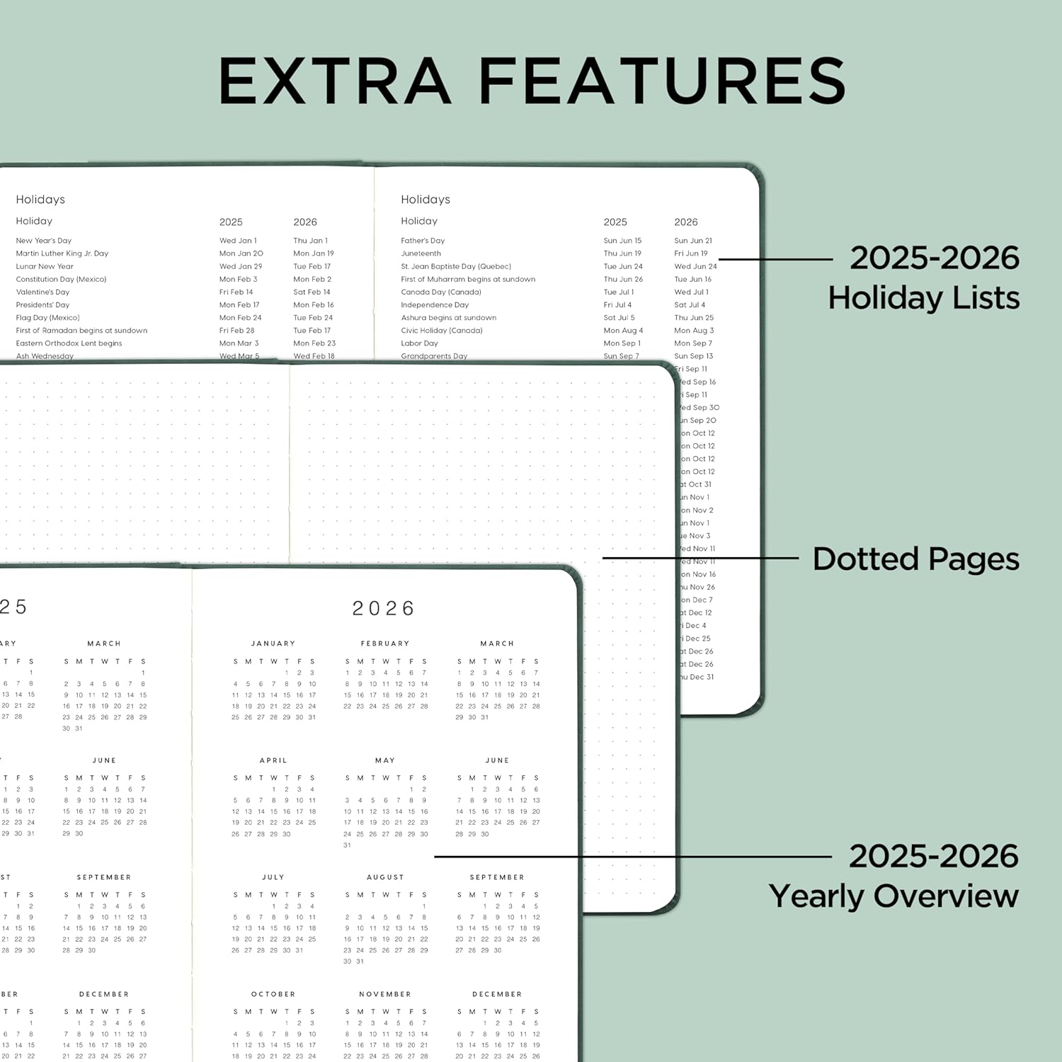 - 【EXTRA FEATURES】The planner includes 2025-2026 calendars,2025-2026 holiday lists and extra 10 dotted pages to write down your thoughts. 12 PCS monthly tab stickers and 2 ribbon bookmarks for easy navigation and finding.
