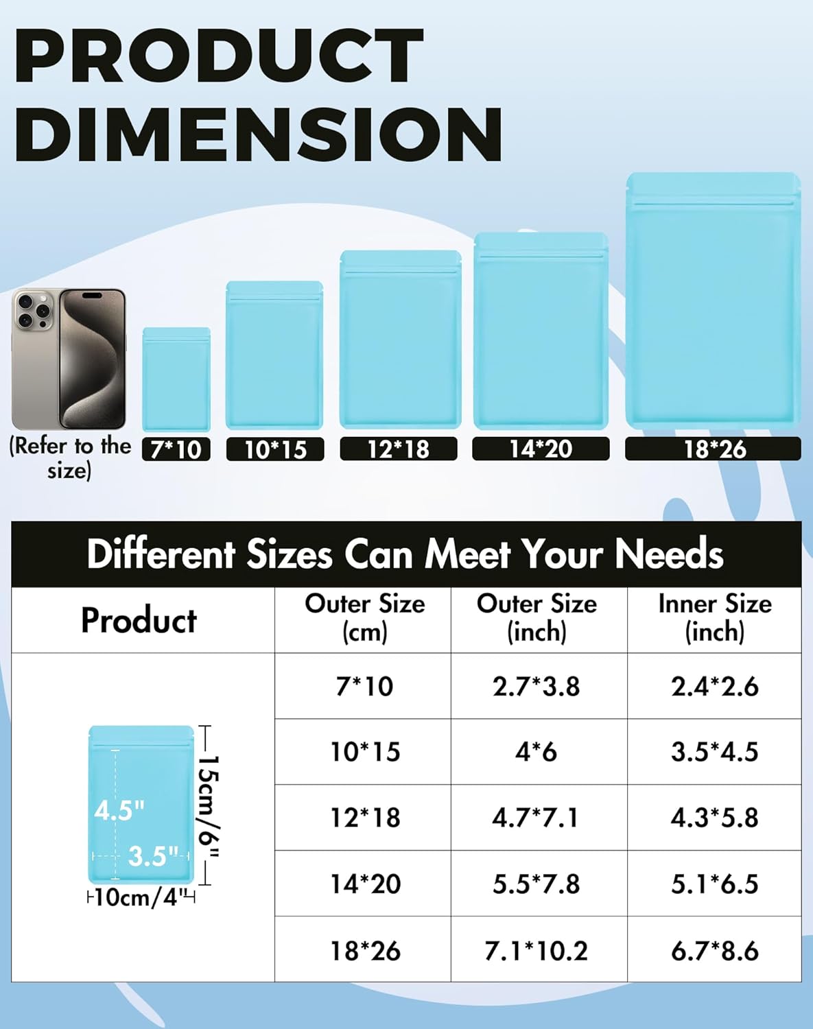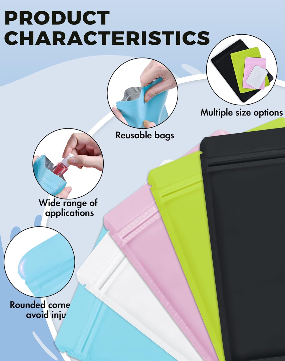 - Premium Quality Sealable Bags: Perfect resealable bags for food stronger with thick barrier layer, matte color surface and aluminum foil interior enhance the durability and aesthetics of the smell proof bags. The resealable zipper is strong enough and won't pop open to ensure the food is safe inside