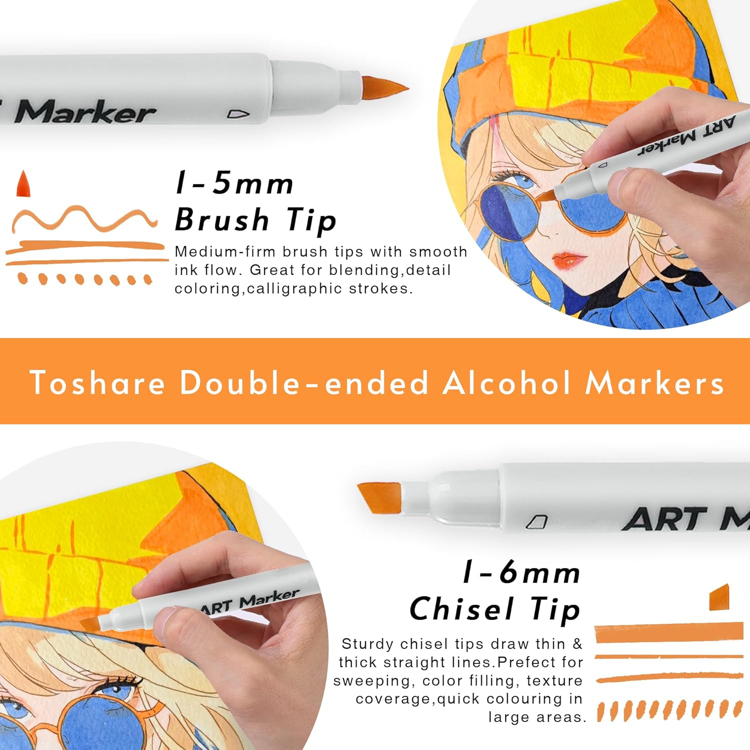 - [ Brush & Chisel Double Tip Alcohol Art Markers ] - Each brush tip marker has a double-ended design, providing great versatility. You can choose the brush tip for sweeping, details, calligraphic strokes or the broad chisel tip for quickly color in large areas.Toshare alcohol brush markers are more durable and do not fray easily.Double-Tip, Double The Fun!
