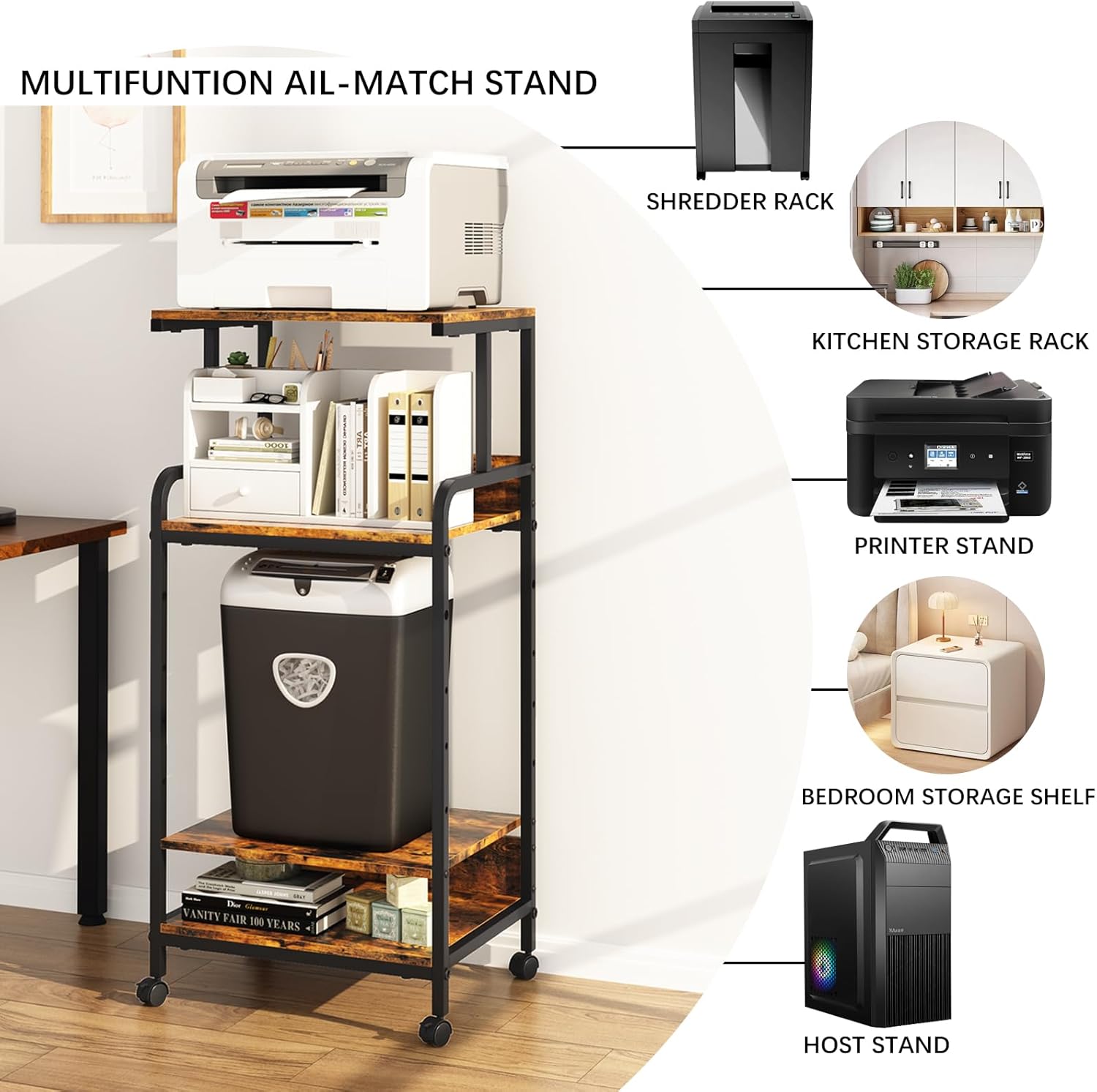 4 Tier Printer Stand with Storage Shelf, Large Tall Printer Cart with Wheels, Mobile Printer Table for Home Office, Adjustable Stands for Heat Press Scanner Fax (Brown)