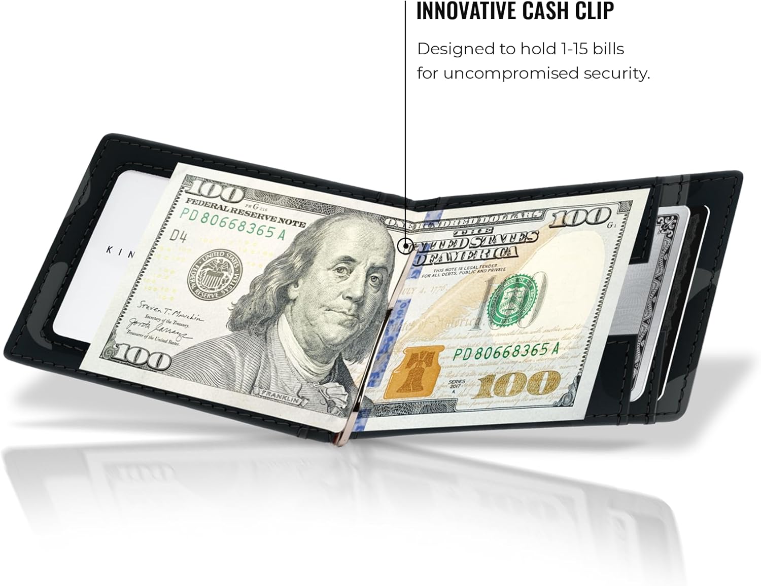 Kings Loot Money Clip Slim Minimalist Wallet for Men – RFID Blocking Leather Design with Money Clip – Front Pocket Bifold Holds 12 Cards – Stylish & Compact Wallets (Camo Black)