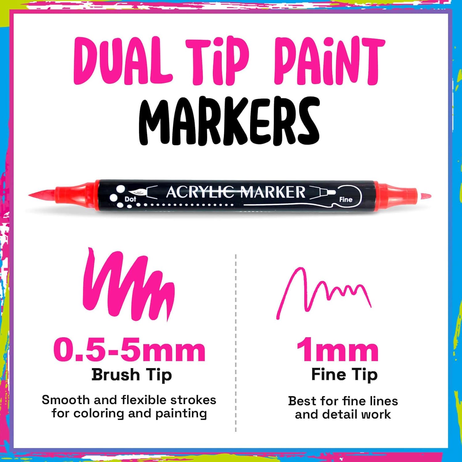 - 【Dual Tip Acrylic Paint Markers】Paint pens acrylic markers include 0.5-5mm brush tip and 1mm fine tip. the acrylic brush markers works well for painting, drawing, calligraphy, lettering and sketching., suitable for filling colors and outlining. The fine tip paint pens is suitable for detailed work.