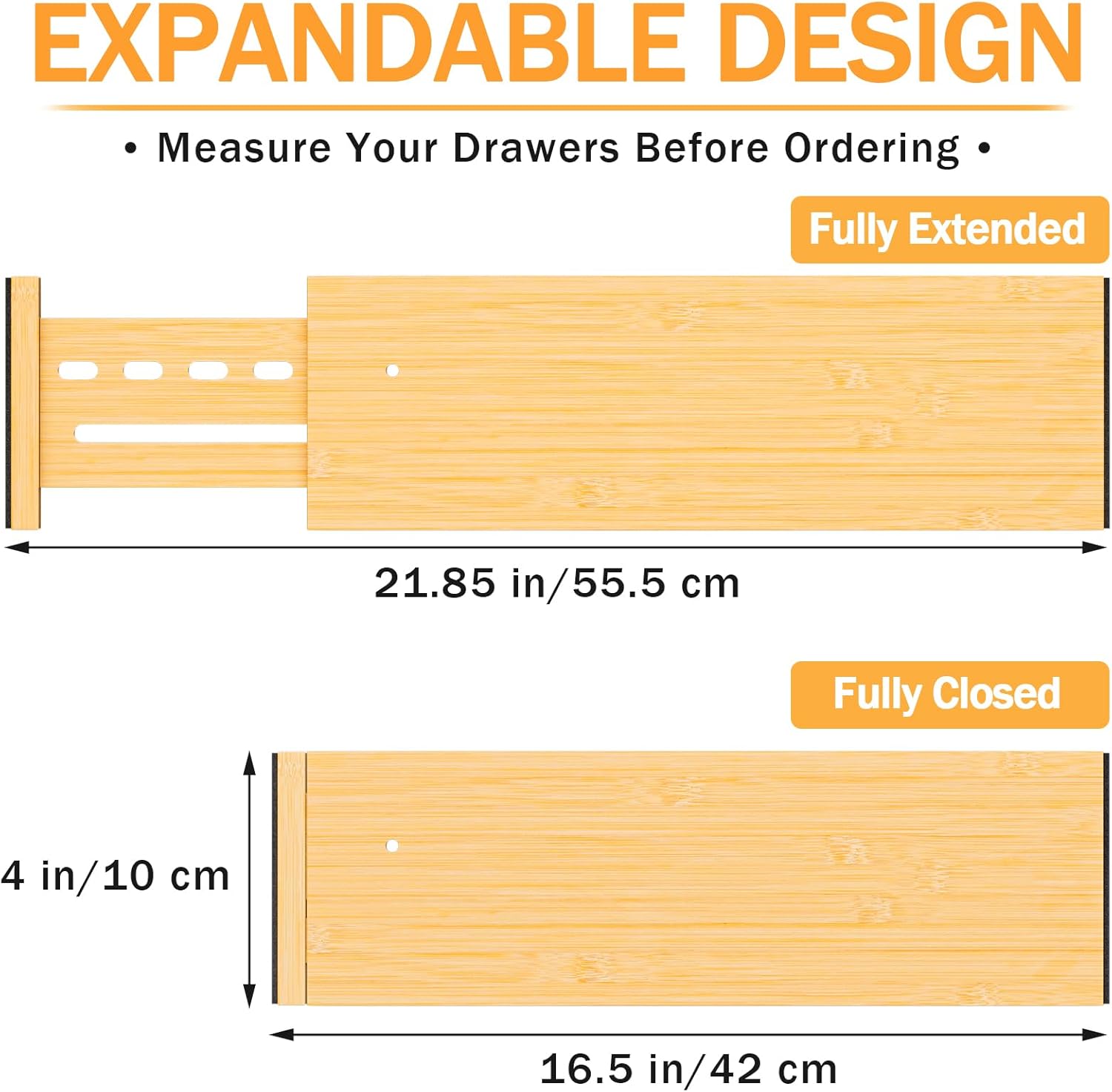 - EXPANDABLE SIZE TO FIT MORE DRAWERS: The drawer dividers are adjustable from 16.5'' to 21.85'' length, 4'' height.The dividers can be used vertically, horizontally or stacked to to meet various organizational needs.PLEASE MEASURE THE DRAWER SIZE BEFORE PURCHASE!