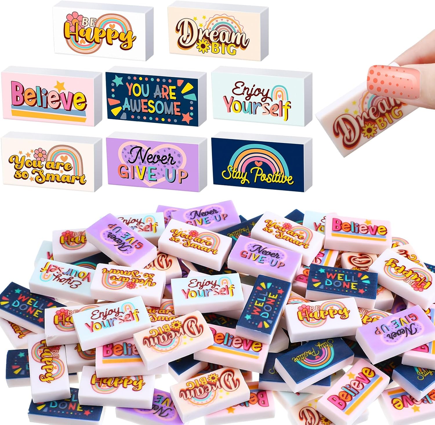 - Inspirational and Fun Design: available in 8 styles and UV printing, these inspirational school erasers sport a variety of cute patterns and powerful words of encouragement such as [you are so smart], [believe], [be happy], [enjoy yourself], [never give up]; These designs are crafted to attract students' attention and provide them with the motivation they need to study more actively and efficiently