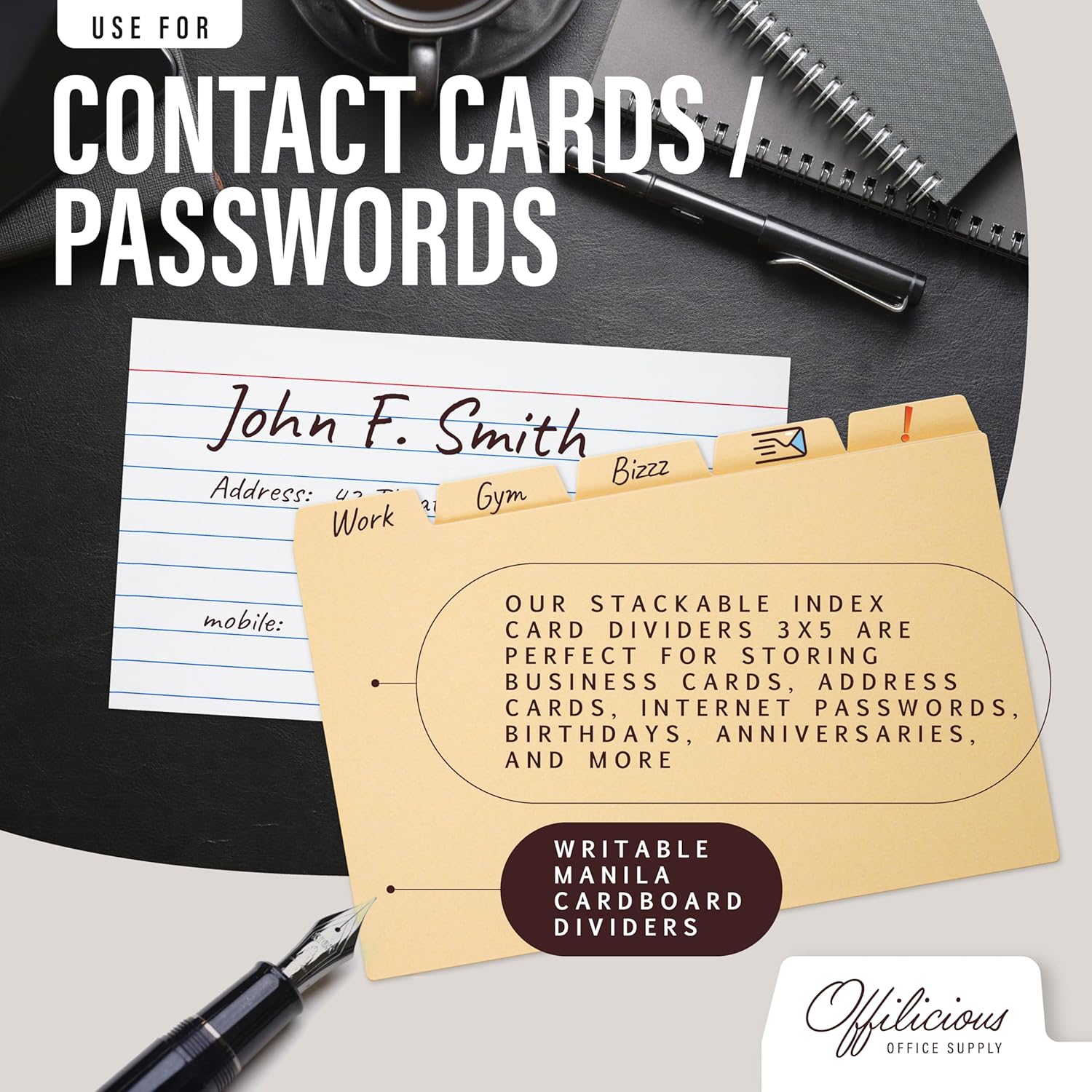 - AT OFFILICIOUS, WE’RE COMMITTED to providing the most QUALITY-CRAFTED index card organizer with dividers accessories. Our index card dividers 5x8 are made with THE BEST MATERIALS for TASTEFULLY DESIGNED, index card divider storage you’ll love for YOUR OFFICE & HOME. If for any reason you aren’t satisfied with your alphabet dividers for index cards, we’re standing by to help!
