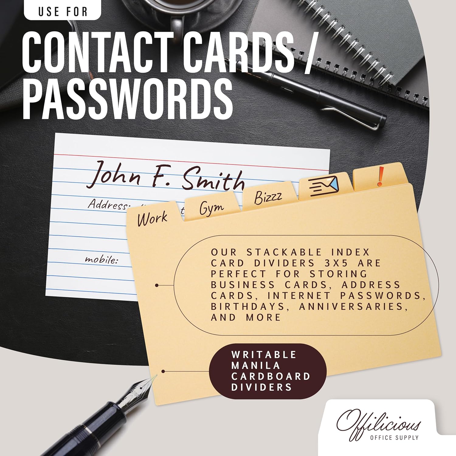 - AT OFFILICIOUS, WE’RE COMMITTED to providing the most QUALITY-CRAFTED index card folder accessories. Our index card tab dividers are made with THE BEST MATERIALS for TASTEFULLY DESIGNED, file cards 4x6 storage you’ll love for YOUR OFFICE & HOME. If for any reason you aren’t satisfied with your alphabet dividers for index cards, we’re standing by to help.