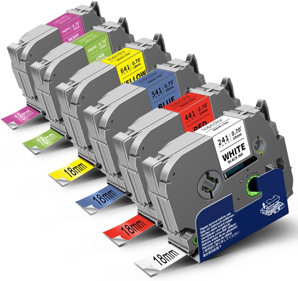 - Package Content: 6 Pack 18mm Label Tape Compatible with Brother ptouch tape 18mm 0.7 TZ-241 TZ-441 TZ-541 TZ-641 TZ-MQG45 TZ-MQP45 tze tz tape 18mm 3/4" label maker refills; Size: 0.7 inch x 26.24 feet ( 18mm x 8m ). Color: Black on White / Red / Blue / Yellow, White on Berry Pink / Lime Green