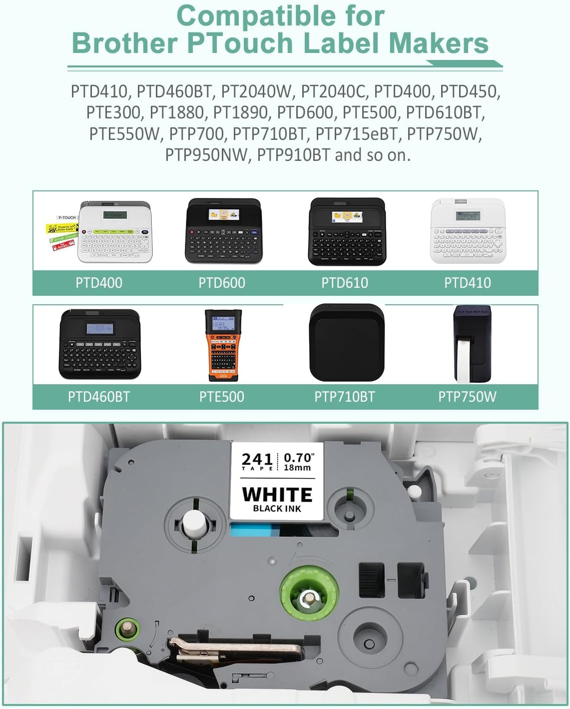 - Compatible for Brother P Touch Tze 18mm Label Makers: PT-D410, PT-D460, PT-D410VP, PT-D610BT, PT-D610BTVP, PT-D600, PT-D400, PT-D450, PT-E300, PT-H300, PT-E500, PT-E550W, PT-H500, PT-P700, PT-P710BT, PT-P715eBT, PT-P750W, PT-18R, PT-18RKT, PT-D800W, PT-E800W, PT-P900, PT-P900W, PT-P950NW, PT-P910BT