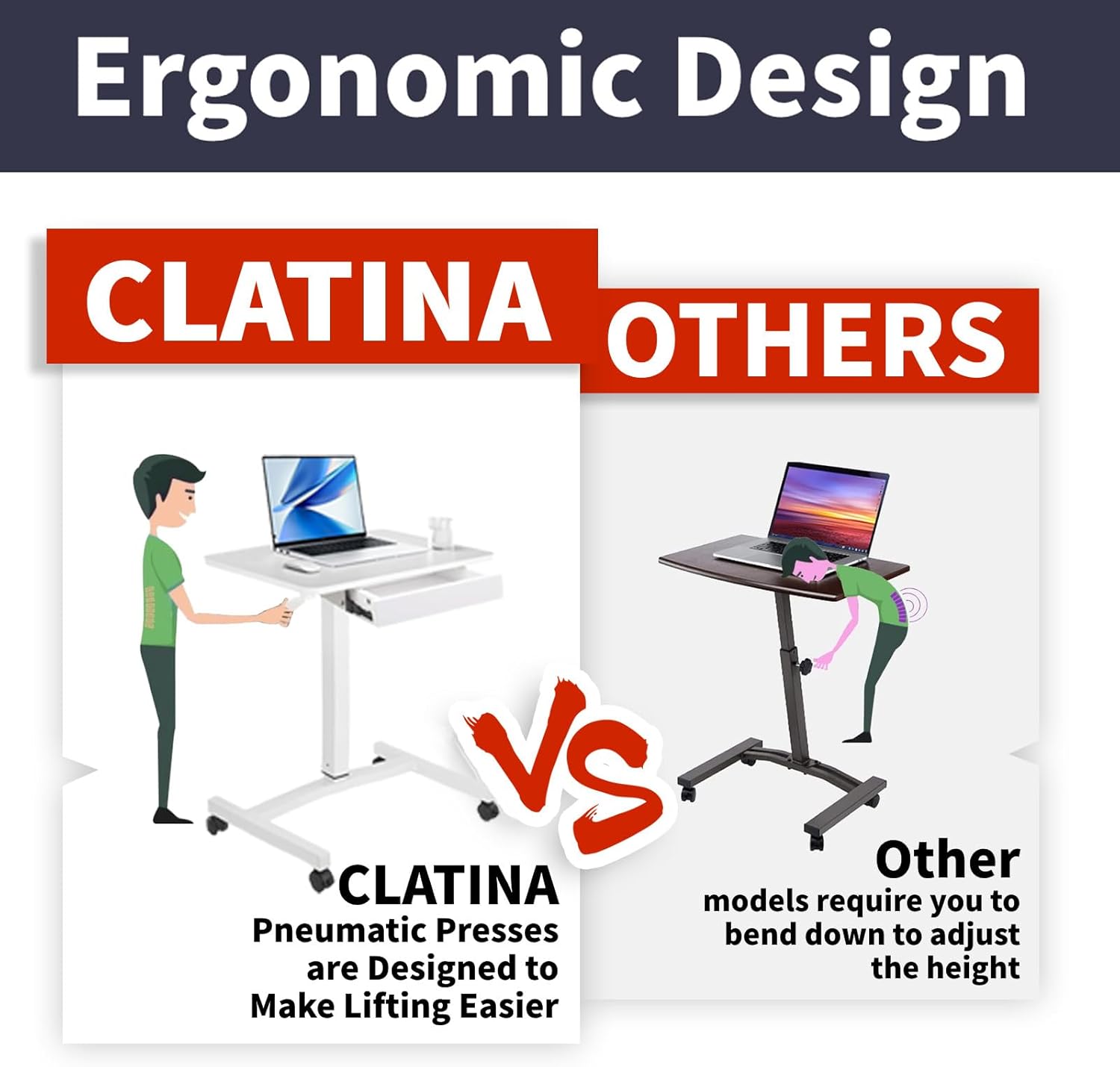 - ăEASY TO INSTALL & PROFESSIONALă: No need for extra mounting tools. We provide detailed manual and all the necessary hardware to help assemble this mobile laptop desk more quick and efficient. we provide worry-free 3-year warranty, and friendly customer service. Come and experience this CLATINA multifunctional mobile standing desk.