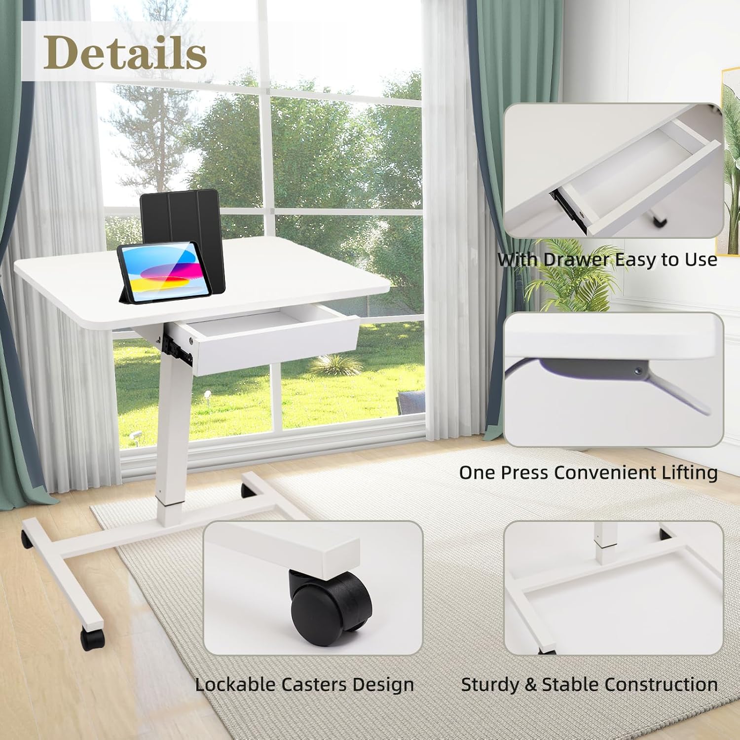 CLATINA Mobile Laptop Standing Desk, Height Adjustable Teacher Podium with Lockable Wheels, Adjustable Work Table with Drawer, Computer Cart Overbed Table for Home Office Classroom, White