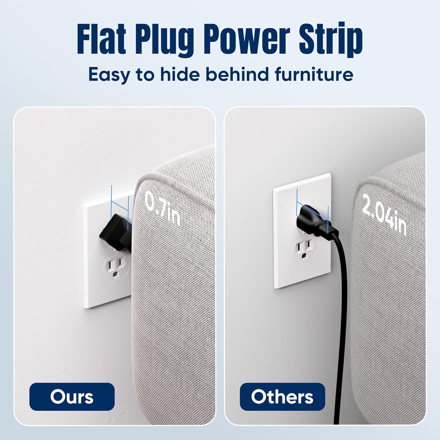 - 【Space Saving Design】- Experience the ultimate in space efficiency with JouleLoom 6FT surge protector's slim flat plug, measuring a mere 0.7 inches thick. Unlike traditional plugs, its unique 45-degree right-angle design ensures it won't obstruct neighboring outlets. Plus, with two multi-directional hanging holes, you can easily mount it horizontally or vertically on workstations, walls, counters, bedrooms, optimizing your space like never before.