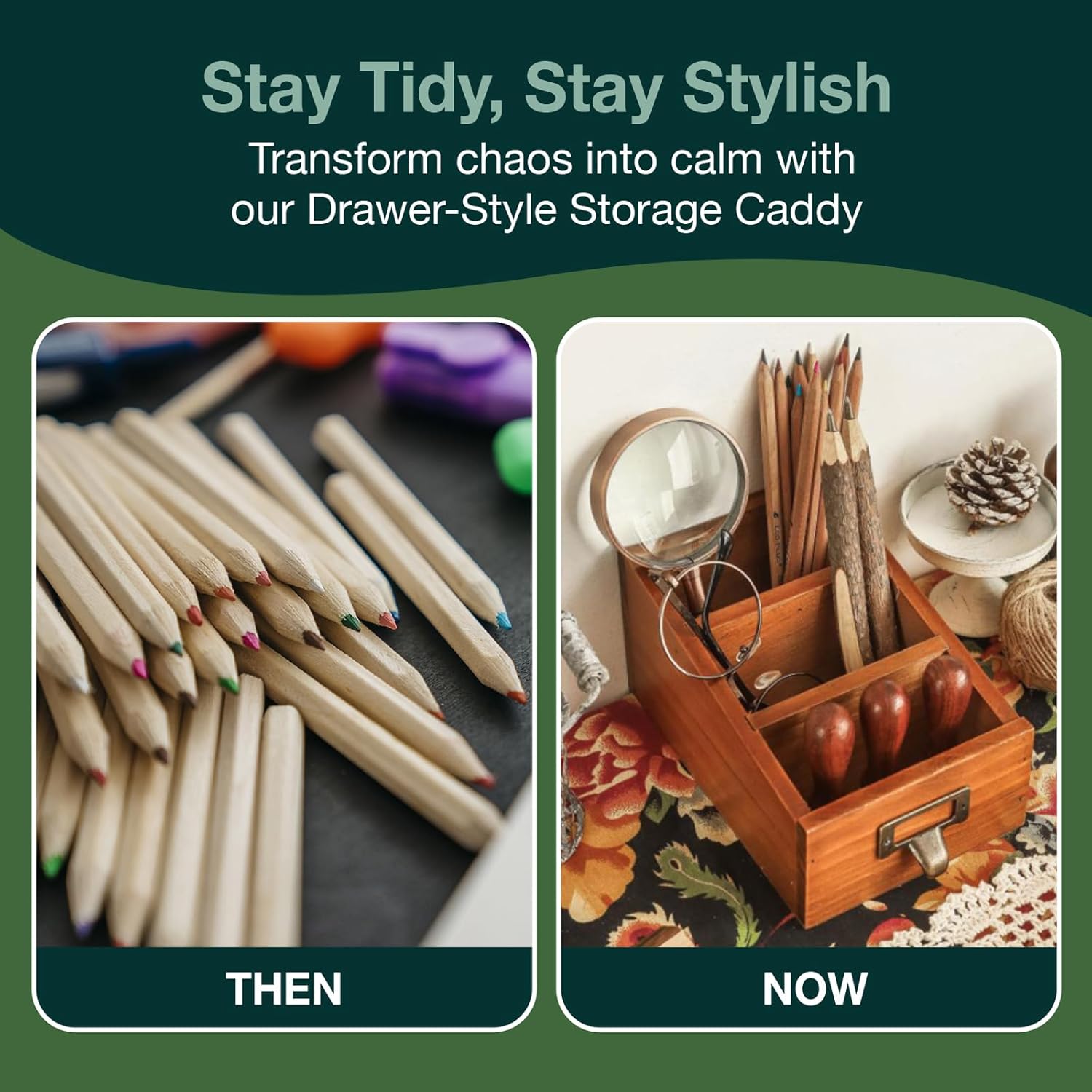 - Transform Your Desk: Declutter your desk accessories using our Wood Storage Caddy. This drawer-like box isn't just for looks; it's designed with 3 compartments to keep your desk tidy and organized, so you'll never struggle to find space for your essentials again.