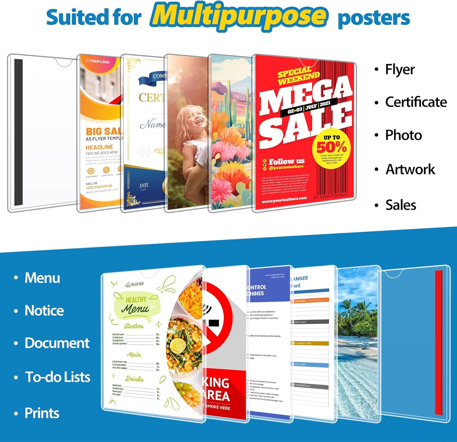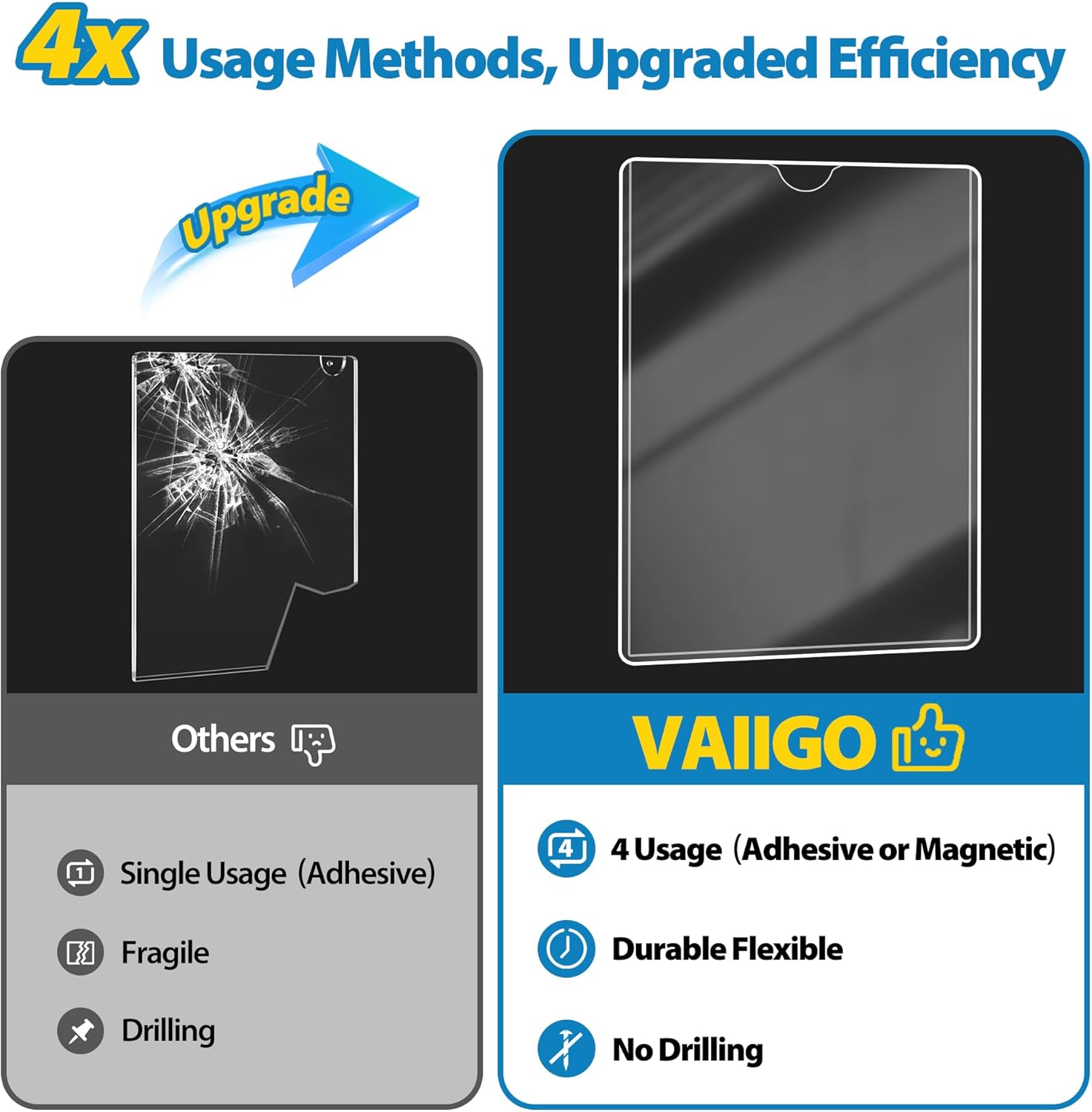 - √ VAIIGO 10Pack Magnetic Sign Holder Package Include - 10Pcs adhesive wall display frame 8.5"x11", 20Pcs magnetic strips, 20Pcs nano adhesive strips. Thickness:0.06". Holds up 4 sheets.