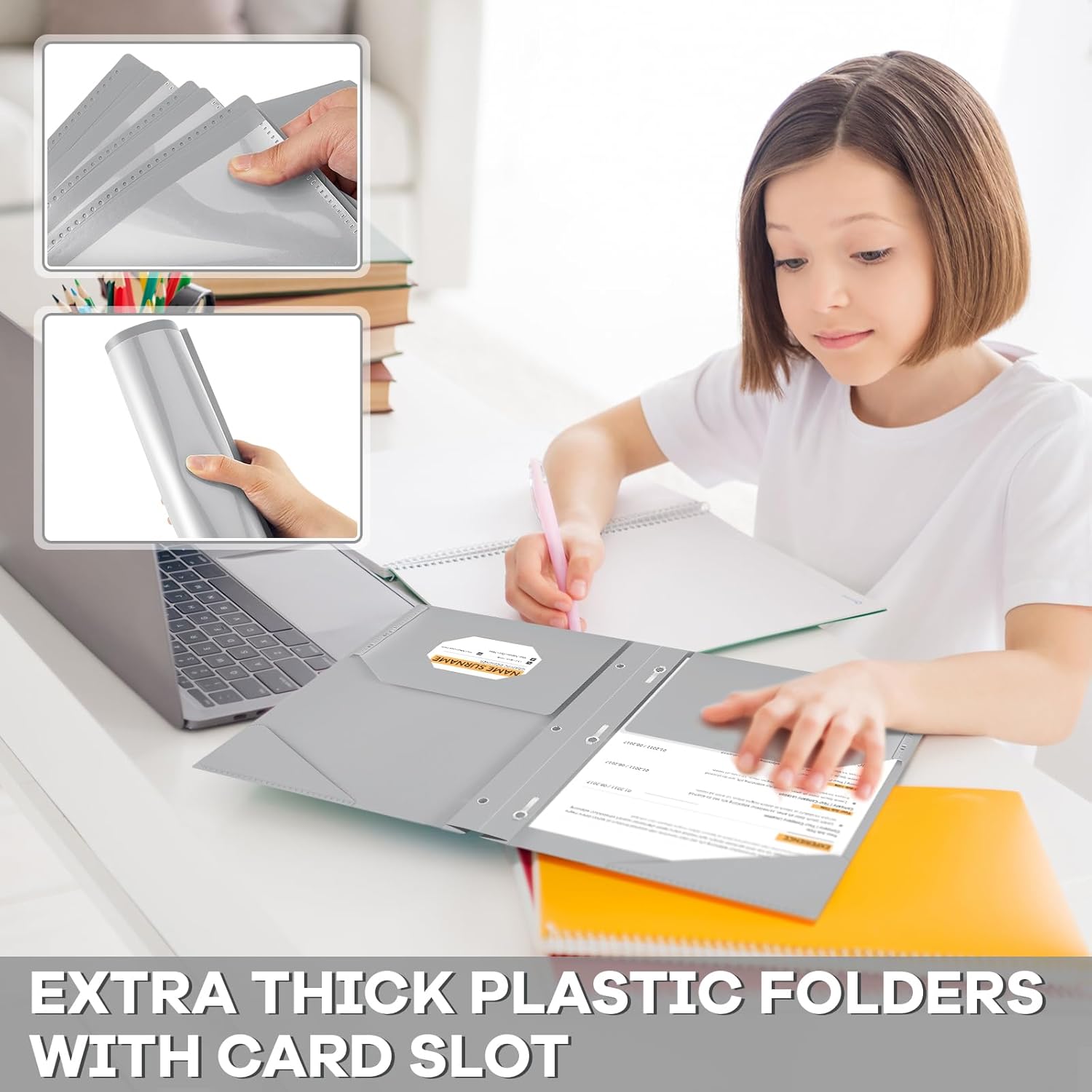 Henoyso 18 Pcs Plastic Folder with Clear Front Pocket and 3 Prong Plastic Folders with Card Slot Pocket Folders with Prongs for School Office (Gray)