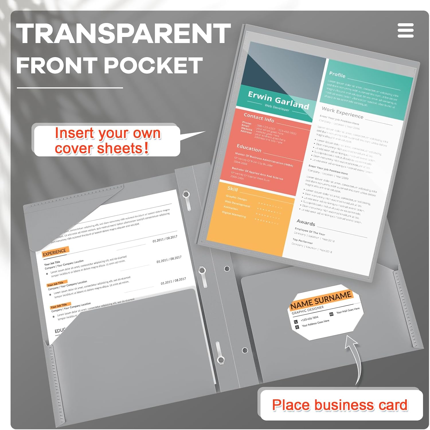 - Practical and Useful: with a clear front pocket, you can put your catalog, tables, favorite reports, presentations and more for clear display; Each plastic folder has 2 internal pockets to help organize and store your letter sized paper and documents, there are also 3 prongs to secure your 3-hole loose leaf paper, and the card slot can hold your ID card or business card, practical for your daily work