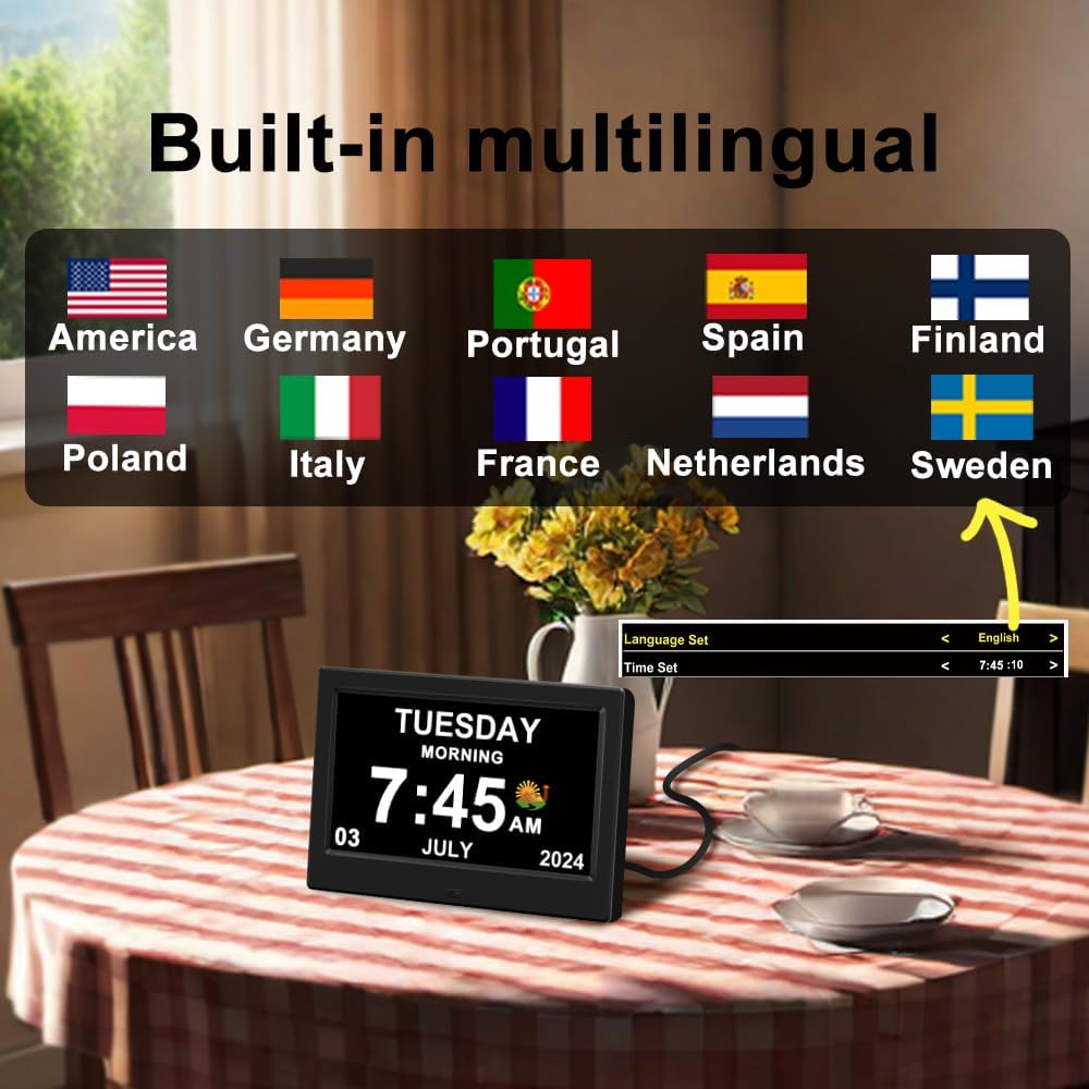- đAuto Diming, 10 national system languagesđ Screen brightness can be set to automatic diming mode, so brightness can be automatically adjusted during the day and night. You can also set a fixed brightness to meet your needs in different occasions; The clock is equipped with 10 national system languages: English, German, Spanish, Portuguese, French, Italian, Dutch, Czech, Polish, Swedish