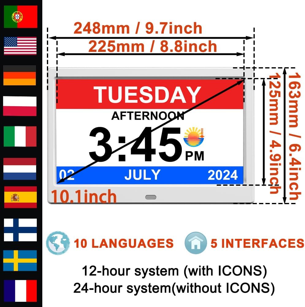 - đAuto Diming, 10 national system languagesđ Screen brightness can be set to automatic diming mode, so brightness can be automatically adjusted during the day and night. You can also set a fixed brightness to meet your needs in different occasions; The clock is equipped with 10 national system languages: English, German, Spanish, Portuguese, French, Italian, Dutch, Czech, Polish, Swedish
