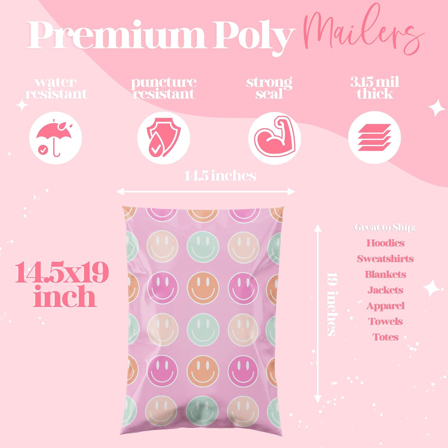10x13 Designer Poly Mailer 100 Pack Heavy Duty Waterproof Self Seal Shipping Bags for Small Business Large Mailing Envelopes Bulk Tear Resistant Cute Packaging Smiley Face