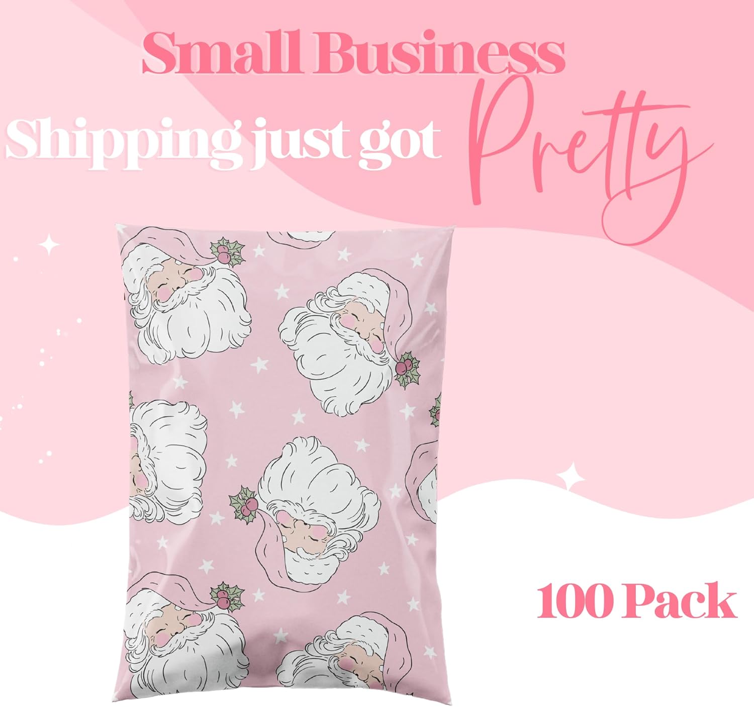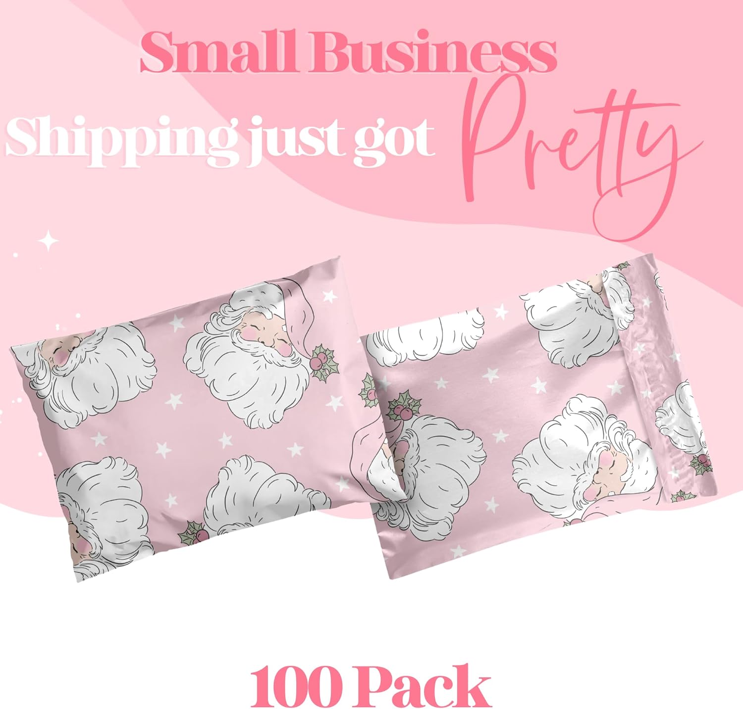 14.5x19 Designer Christmas Holiday Poly Mailers 100 Pack Heavy Duty Waterproof Self Seal Shipping Bags Large Mailing Envelopes Bulk Tear Resistant Cute Packaging Pink Santa